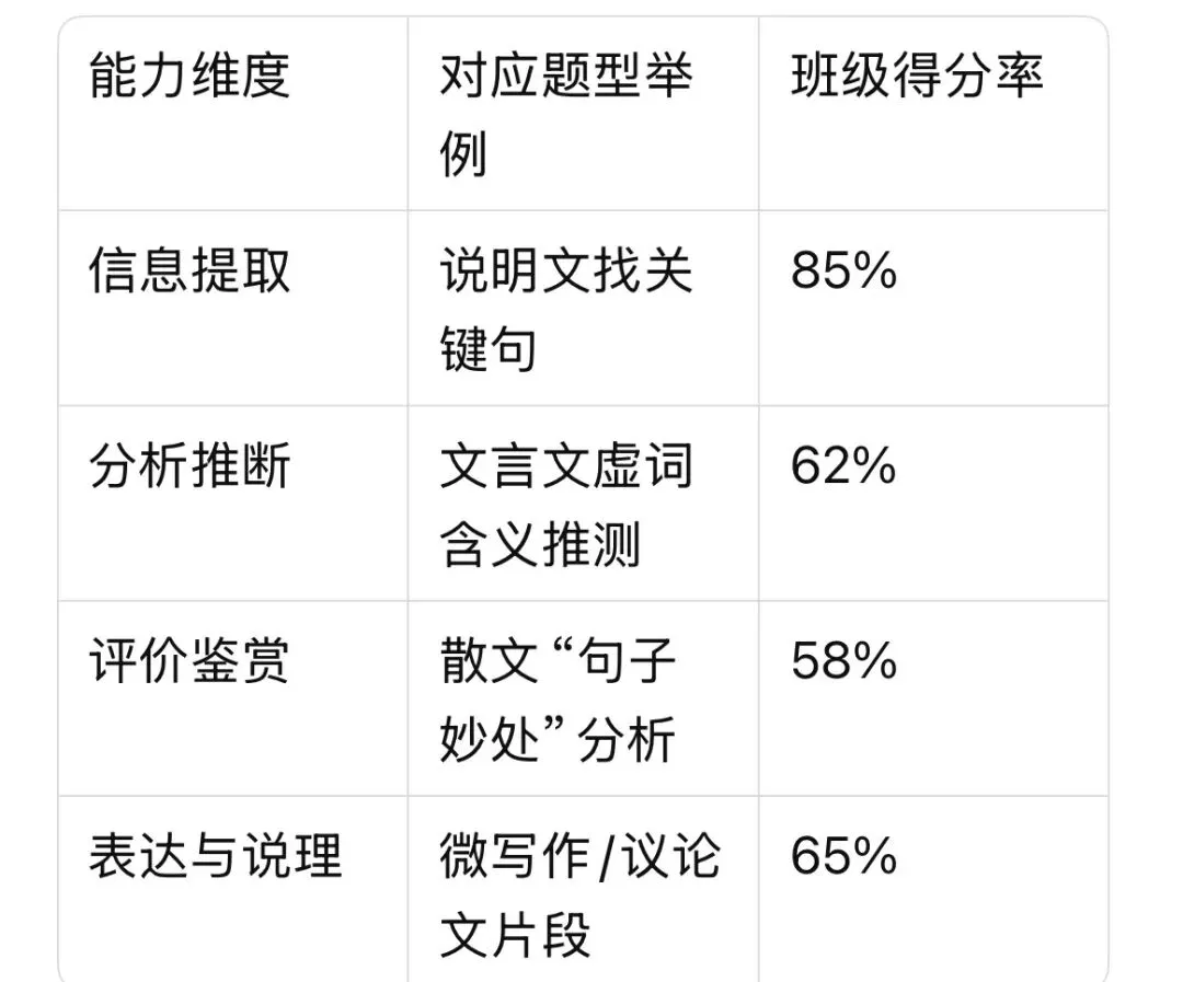 教师完成上面表1+表2,并抽5分钟在班里口头反馈:“这次我们班最大的问题不是字词,是阅读题里的“鉴赏评价”没章法,下周我们专练这个。”