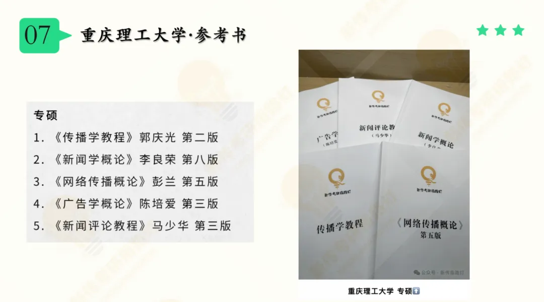 近几年重庆理工大学的参考书基本上都是经典五本—传播学、新闻学、网络传播概论、广告学概论、新闻评论教程,这样稳定的参考书范围特别适合27的同学们备考哟,因为无需过于担心后期“换书的风险”,只需要每天安安心心的复习就好啦~