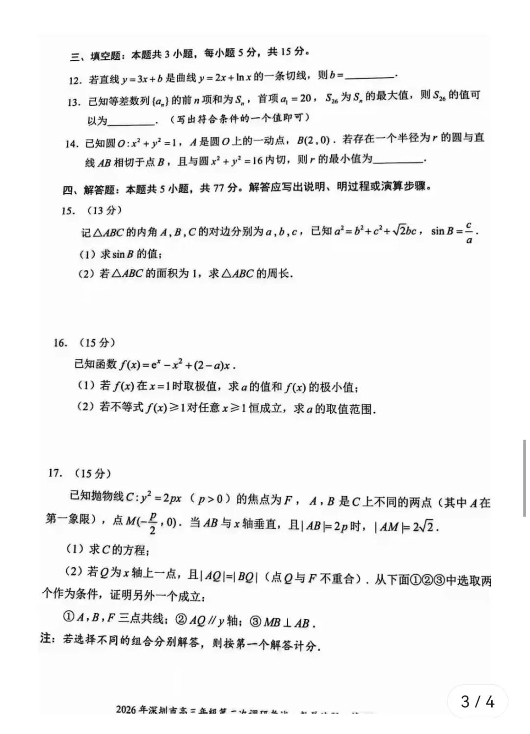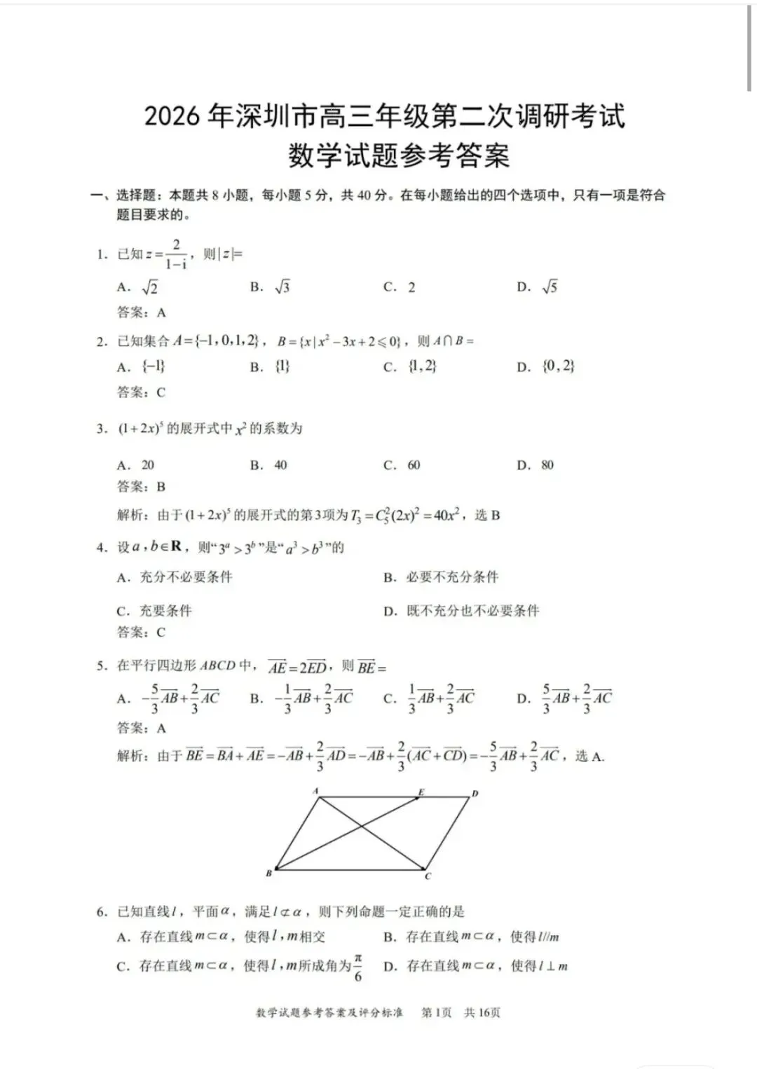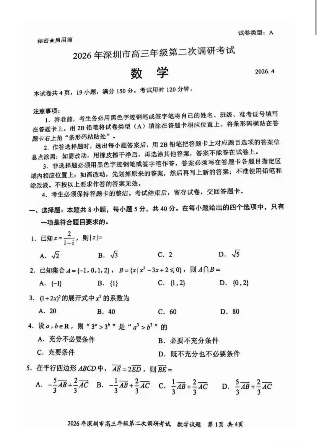 >2026深圳二模数学试卷及答案