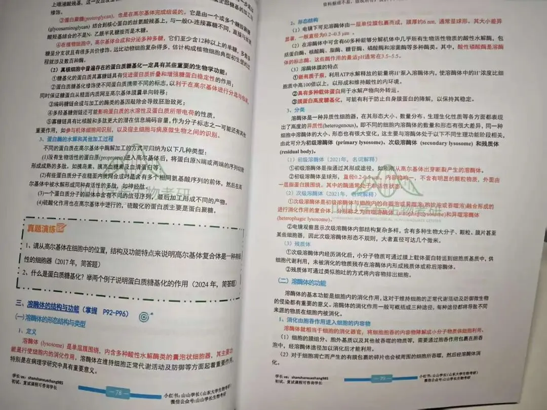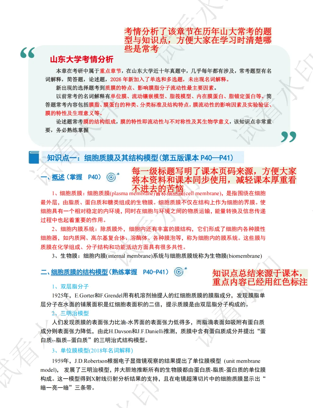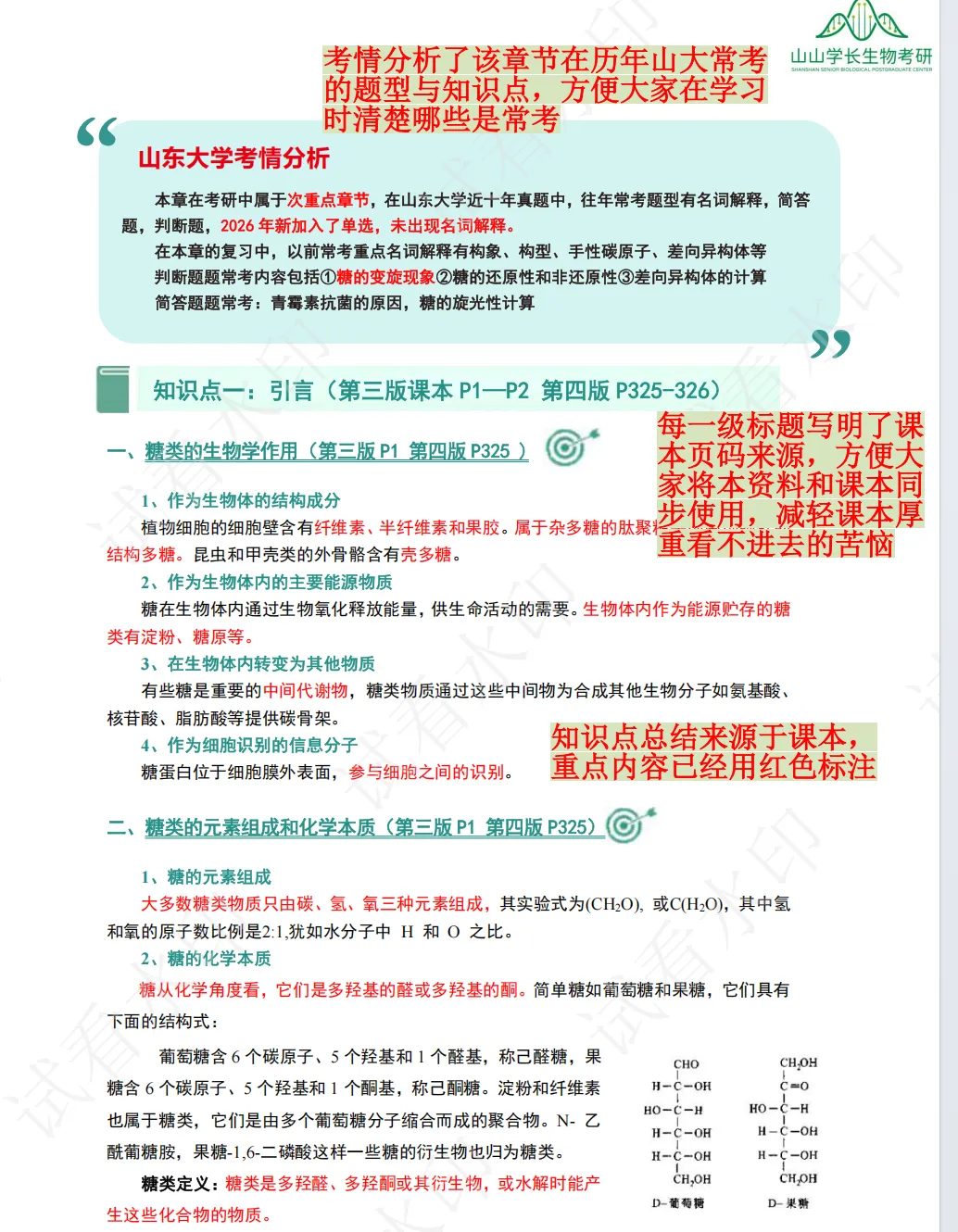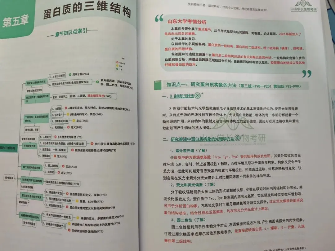 1、参考的书像砖头一样厚重、不知道该看哪些、看不完等等;2、买的各种资料质量参差不齐,全是文字没有图片(个人觉得一轮学习必须要图文结合,没有图的资料只适合后期背诵使用),不知道如何下手使用;3、不知道考试侧重点,也不清楚每一个知识点怎么考,该怎么学等等以上问题也是我们在整理资料考虑到的,因此,我们资料是对课本内容的一个详细整理,文字和图片结合,每个章节明确了山东大学考情分析,每个知识点后面添加该知识点近些年真题题目历时五个月的时间,我们整理的27山东大学生物考研专版知识宝典在四月中旬已经全面上架,知识宝典也是目前市面上唯一的山东大学生物考研的专版知识点笔记资料!! 该资料应该是山东大学生物考研er人手必备的资料,一份好的资料可以达到事半功倍的学习效果!!!(文末附价格与购买途径)所谓的专版资料指使用山大推荐教材内容详细进行整理,所有内容都是根据山东大学考纲以及考情进行整理,每个章节添加山大考情分析,每个知识点后面添加该知识点近几年考过的真题等等,下文会详细介绍该资料内容非常全面,适合大家一轮学习使用和后期背诵使用- 该知识点笔记是一个详细的知识点总结,可以使用知识点笔记和网课进行学习,并在资料上做好笔记;