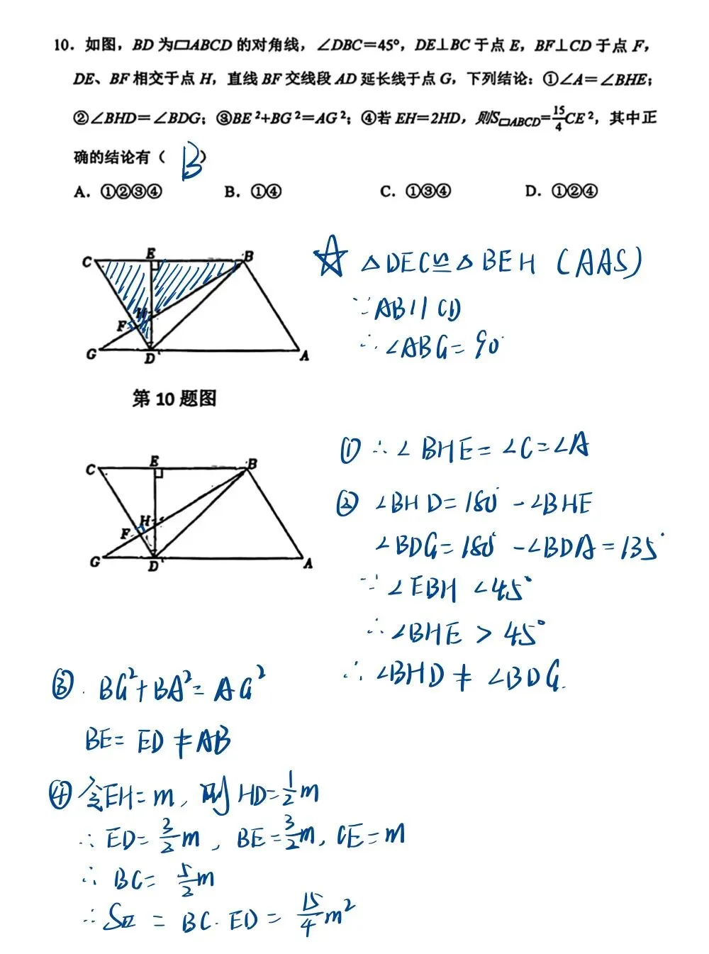 | 「第 10 题」 | 平行四边形折叠与角度推导。涉及 4 个结论的综合判断。 | 利用 ∠DBC=45°得出等腰直角三角形,结合全等与相似推导。 |