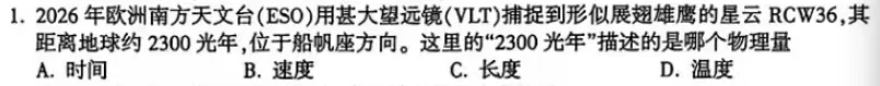 选择题第 1 题,光年单位辨析。几乎每次涉及宇宙天文题目,都有孩子选错,坚定认为光年是时间单位。