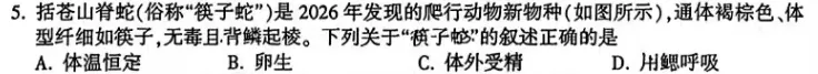 选择题第 5 题,爬行动物特征判断。恒温、卵生、呼吸器官、受精方式,四类动物特征混杂在一起,孩子记忆混乱,频繁选错。