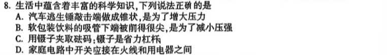 选择题第 8 题,生活科学原理综合题。吸管尖锐是减小受力面积增大压强,很多孩子记成减小压强;家庭电路开关必须接在火线上,不能接零线;省力杠杆费力杠杆判断错误,生活情境结合物理知识,孩子脱离课本就不会分析。