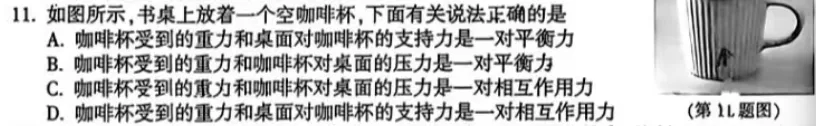 选择题第 11 题,平衡力与相互作用力。初中物理第一易错题,没有之一。同一个物体受力是平衡力,两个物体相互受力是相互作用力,受力物体不同,受力性质完全不同,只要审题不仔细,百分百出错。