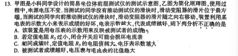 选择题第 13 题,电路动态压轴题。滑片移动电阻变化,电压电流变化比值,定值电阻阻值不变,电路串联分压规律,综合欧姆定律计算,中等孩子基本都会在这里失分,也是拉开高分差距关键题目。