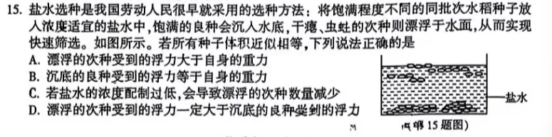 选择题第 15 题,浮力浮沉条件。饱满种子下沉,干瘪种子漂浮,漂浮浮力等于重力,下沉浮力小于重力,同种液体浮力由排开液体体积决定,孩子逻辑混乱,无法快速判断大小关系。