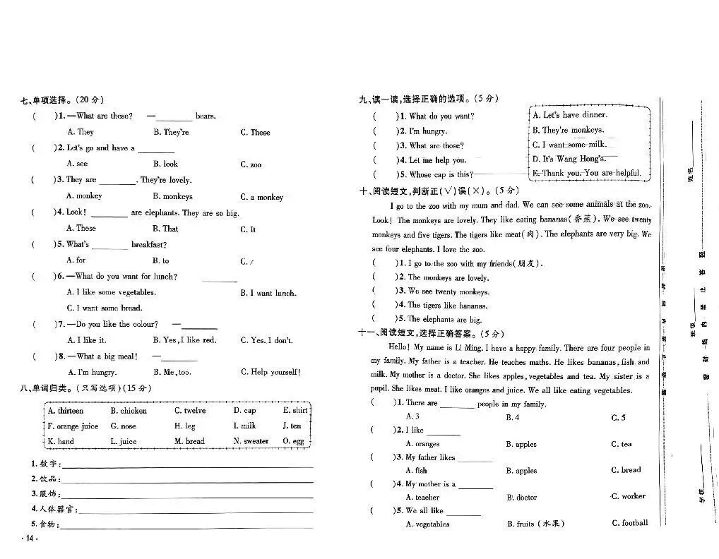 鲁科版小学英语三年级下册期中质量检测试卷