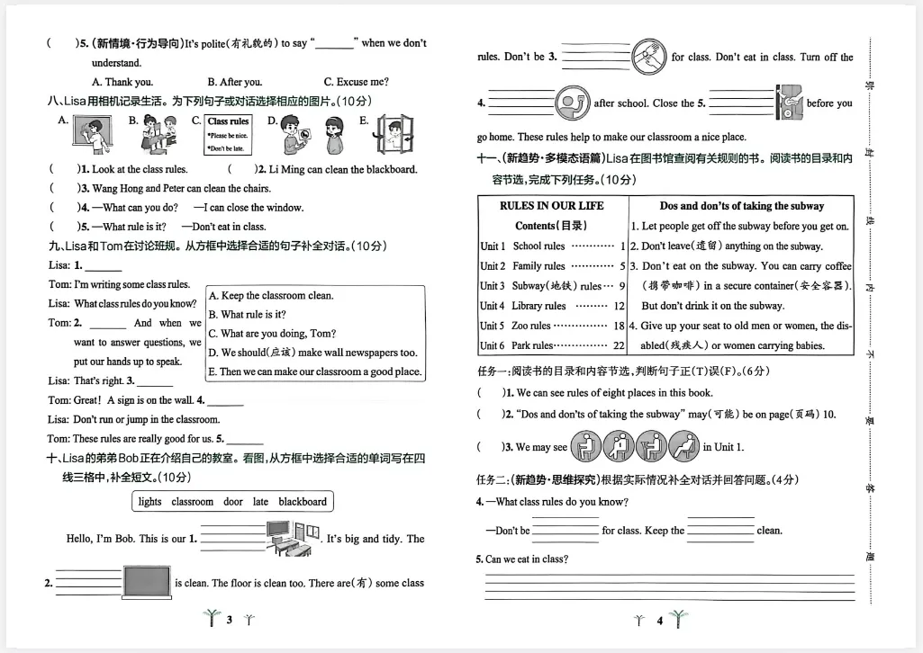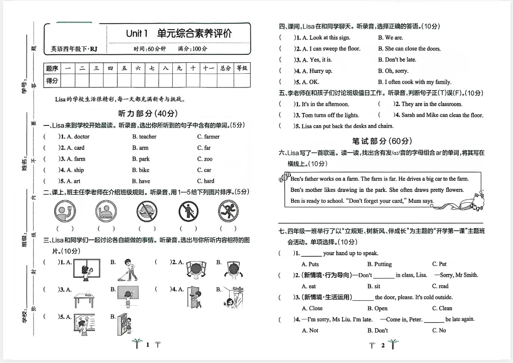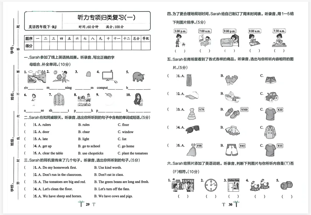 新版四年级下册人教pep版英语试卷,包含: