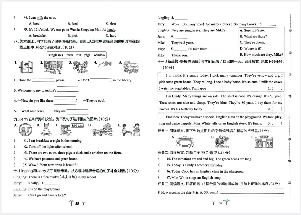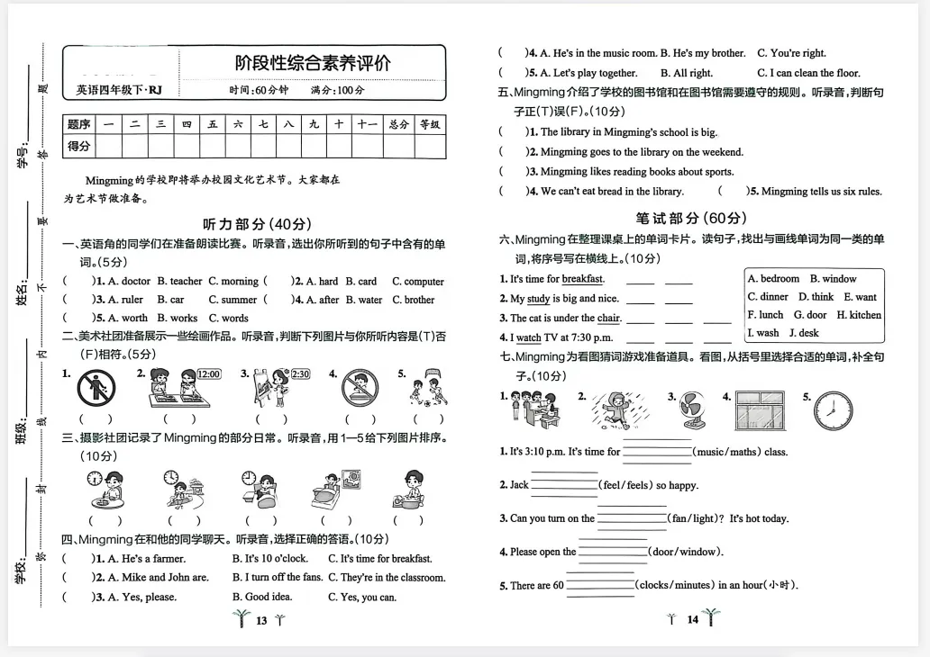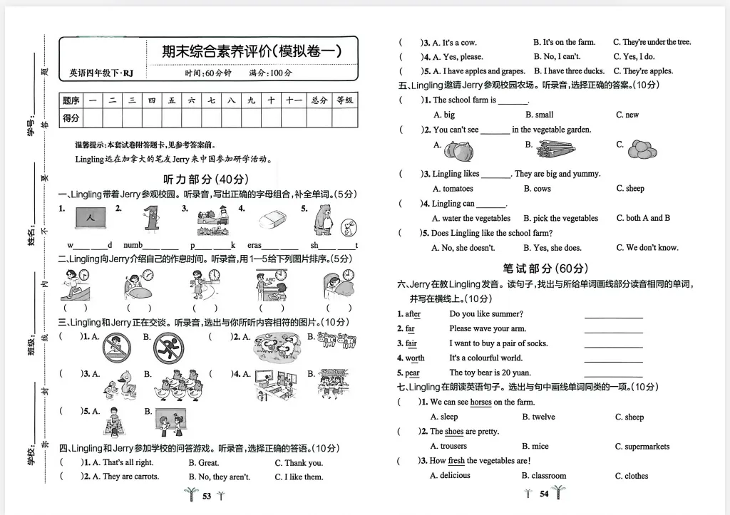 新版四年级下册人教pep版英语期末综合素养卷共4套,,附答题卡
