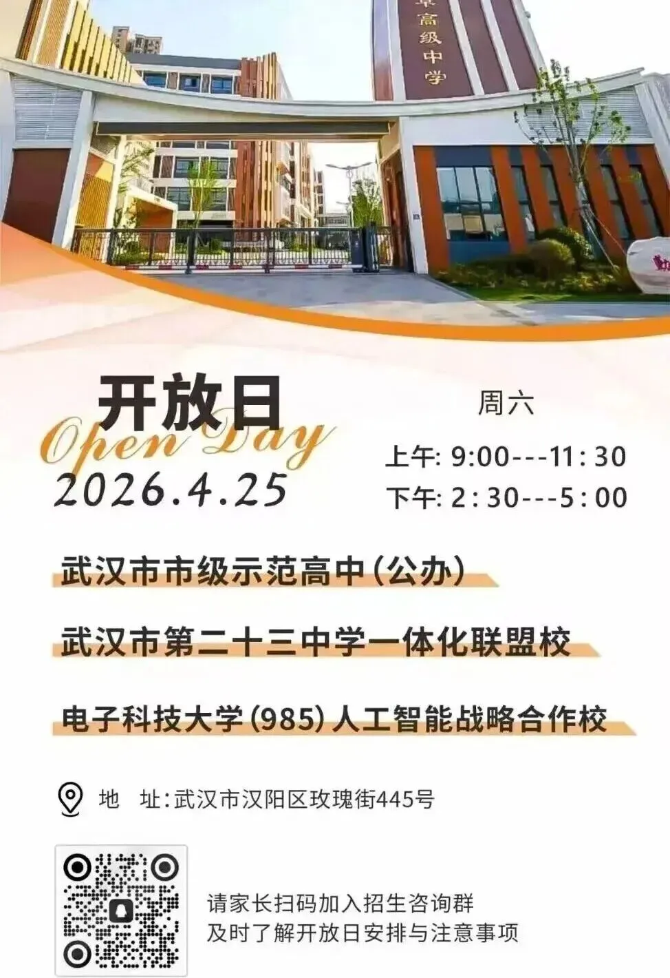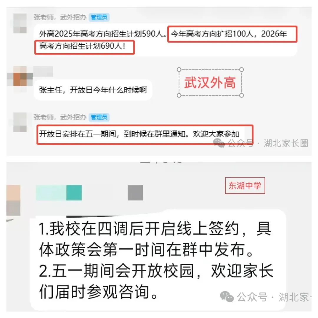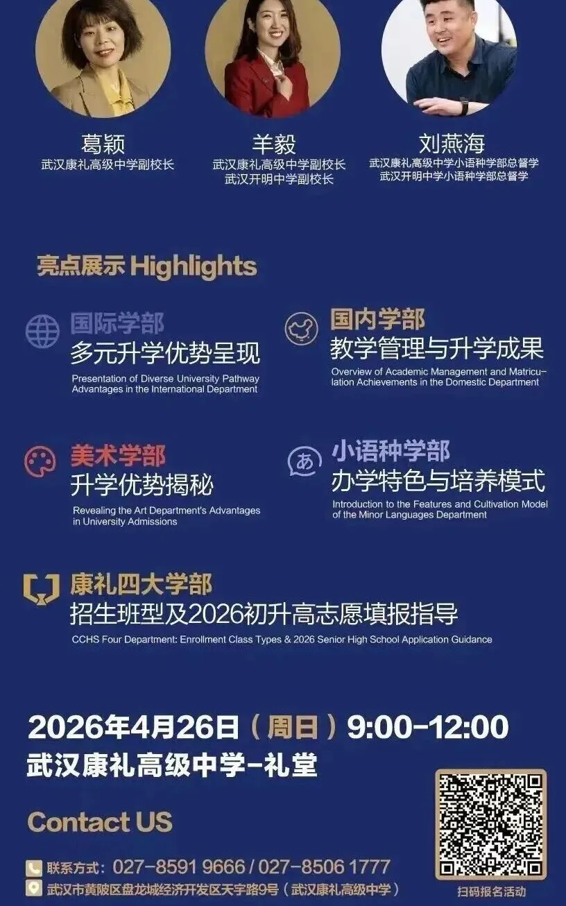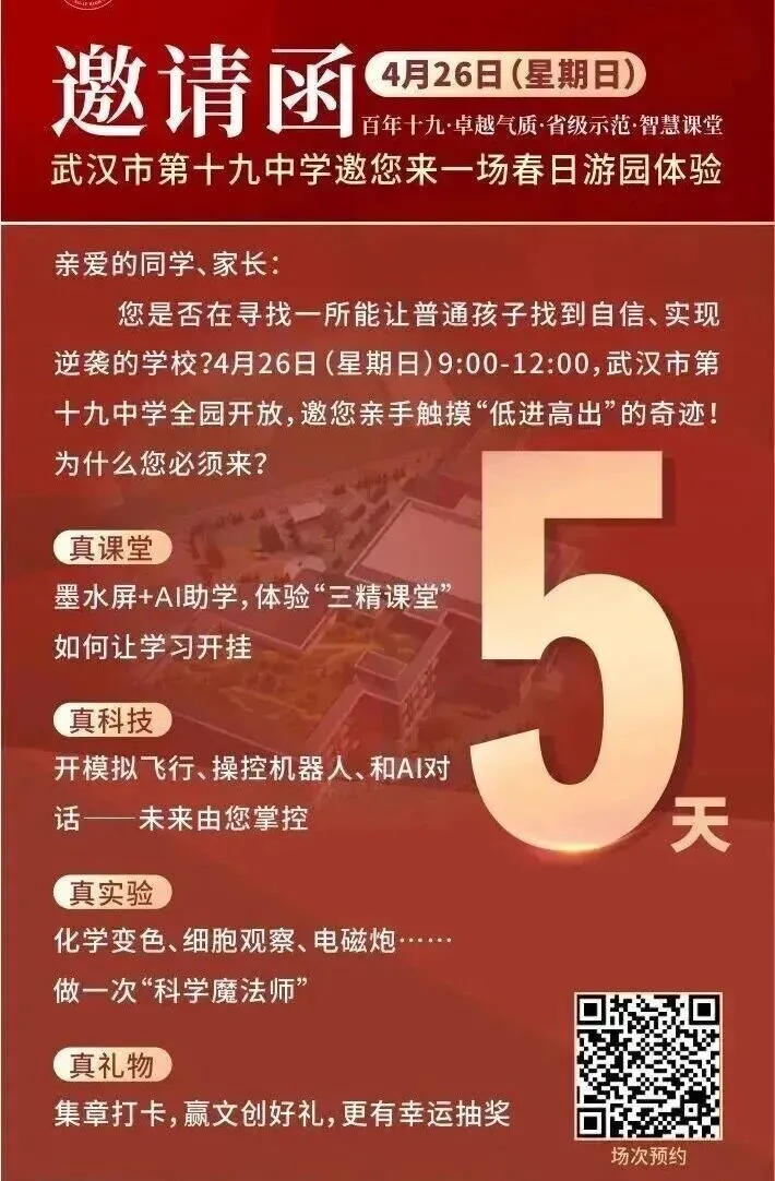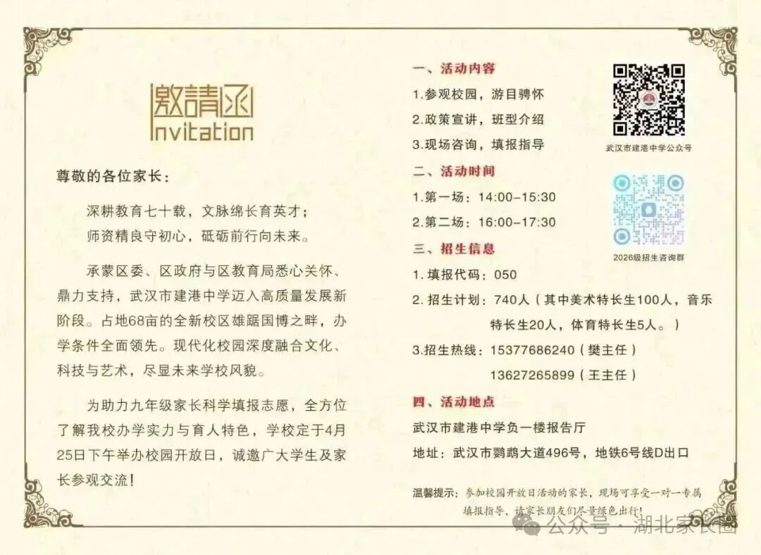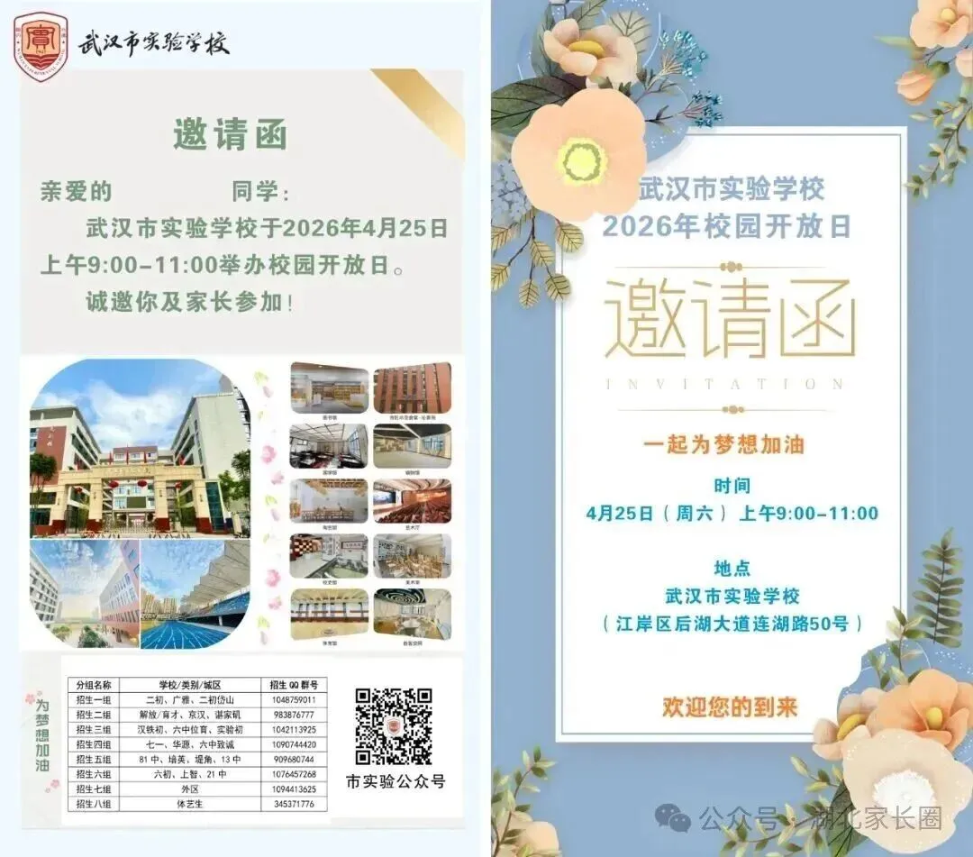 小颀获悉,四月调考继续,距离中考志愿填报截止时间为数不多!是坚持原来的目标学校,还是根据四调成绩重新调整?是走国内高考,还是考虑转轨国际?每一个选择都关乎孩子的未来。别慌!从本周到五一假期前后,武汉多所高中集中举办校园开放日,正是您带孩子实地考察、重新锁定升学方案的最佳时机。建议收藏备用!特别提醒:四调成绩出来后,很多家长开始重新考虑“保底校”和“转轨方案”。防掉档、备转轨,这个五一就是最后的窗口期。建议您带孩子至少走访2-3所不同梯度的学校,现场签约、班型解读、政策红利一次搞懂。点击图片可查看大图▽如果您还在为以下问题纠结:四调成绩不上不下,普高线边缘怎么填?国际学校和民办高中到底怎么选?想转轨但完全不了解入学要求和升学成绩?别把问题带回家。5月5日(周二)上午 一场汇聚武汉20+顶尖国际学校/民办高中的教育展 专为您解决“四调后的选择困难症”而来🔥 5月5日·武汉国际学校/民办高中教育展⏰时间:5月5日(周二)08:30📍 地点:武汉桃花岭大酒店(螃蟹岬A1口)✅25+所名校现场宣讲:办学理念、升学成绩、入学要求全公开✅家长100主播+名校老师1v1指导:转轨国际、国内路径怎么选?✅小初高全龄覆盖:课程提升、留学规划、语言提分、转轨一站式解决到场即领2本独家手册(限量):《2026武汉国际学校择校家长手册》+《高考or留学—武汉家长升学手记》最后几天,别让犹豫耽误孩子无论您最终选择哪条路,多听、多看、多问,才能做出不后悔的决定。小颀祝孩子们四调取得理想成绩,志愿填报一击即中!来源:家长100综合