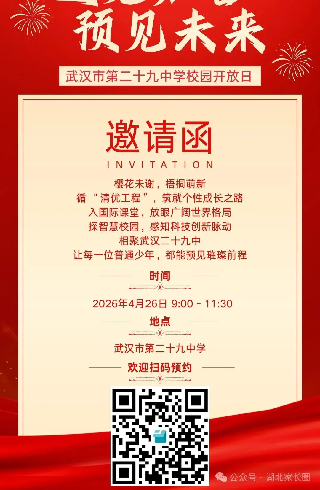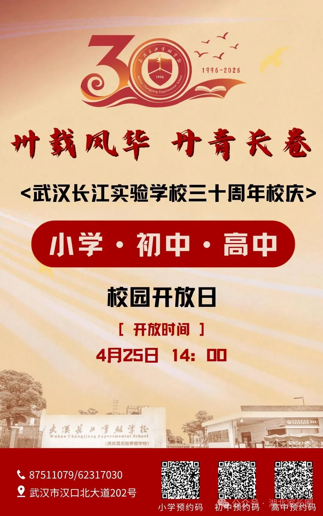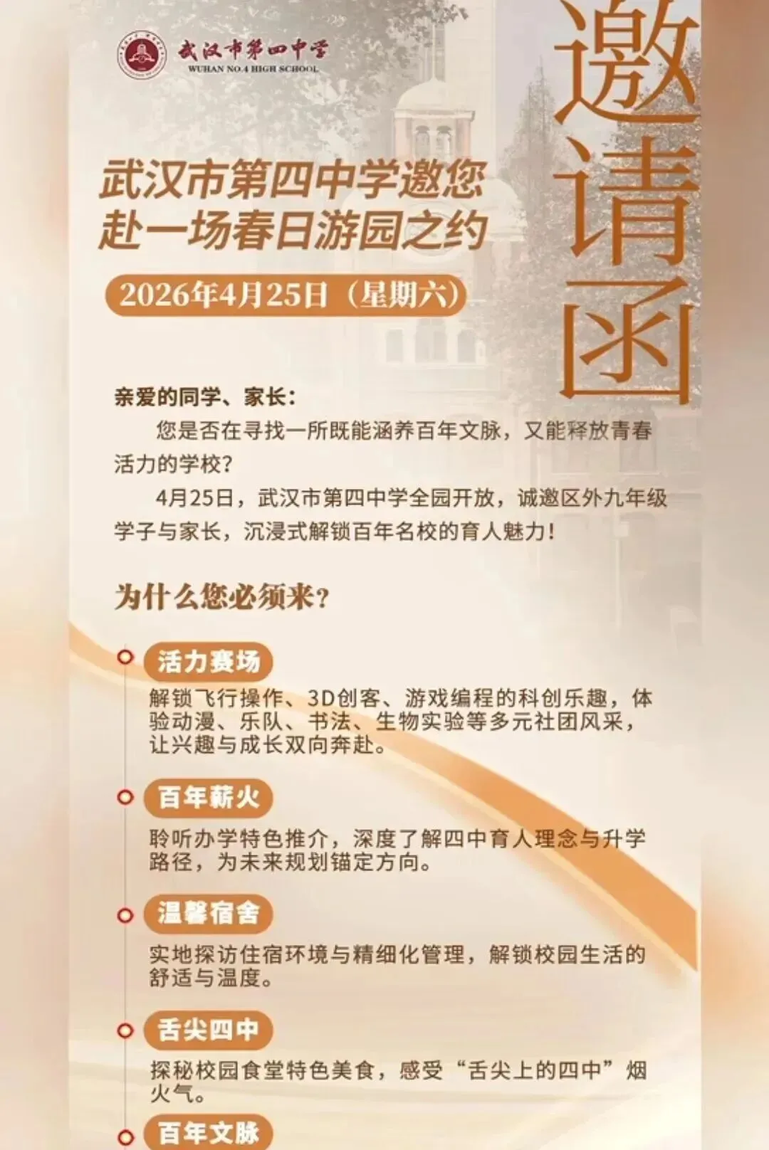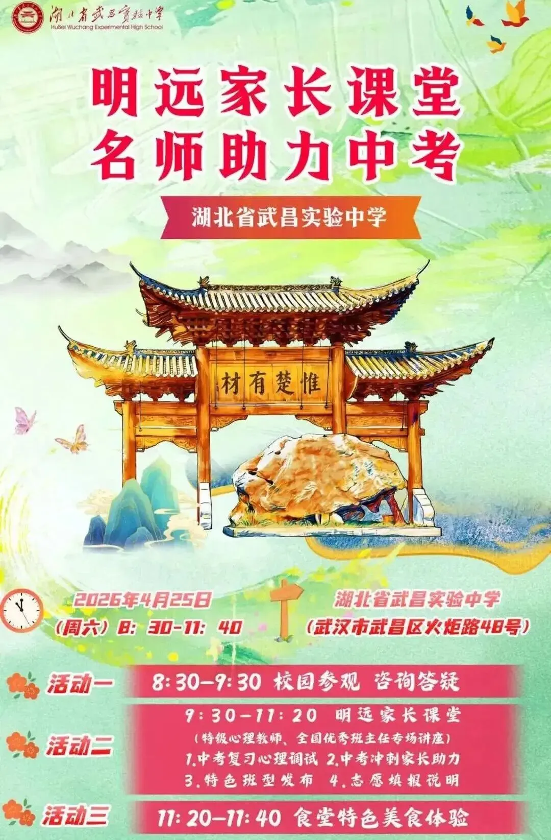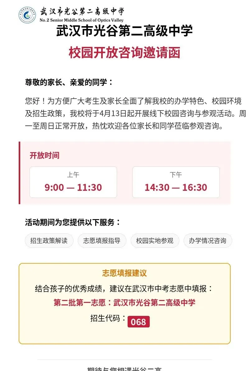 小颀获悉,四月调考继续,距离中考志愿填报截止时间为数不多!是坚持原来的目标学校,还是根据四调成绩重新调整?是走国内高考,还是考虑转轨国际?每一个选择都关乎孩子的未来。别慌!从本周到五一假期前后,武汉多所高中集中举办校园开放日,正是您带孩子实地考察、重新锁定升学方案的最佳时机。建议收藏备用!特别提醒:四调成绩出来后,很多家长开始重新考虑“保底校”和“转轨方案”。防掉档、备转轨,这个五一就是最后的窗口期。建议您带孩子至少走访2-3所不同梯度的学校,现场签约、班型解读、政策红利一次搞懂。点击图片可查看大图▽如果您还在为以下问题纠结:四调成绩不上不下,普高线边缘怎么填?国际学校和民办高中到底怎么选?想转轨但完全不了解入学要求和升学成绩?别把问题带回家。5月5日(周二)上午 一场汇聚武汉20+顶尖国际学校/民办高中的教育展 专为您解决“四调后的选择困难症”而来🔥 5月5日·武汉国际学校/民办高中教育展⏰时间:5月5日(周二)08:30📍 地点:武汉桃花岭大酒店(螃蟹岬A1口)✅25+所名校现场宣讲:办学理念、升学成绩、入学要求全公开✅家长100主播+名校老师1v1指导:转轨国际、国内路径怎么选?✅小初高全龄覆盖:课程提升、留学规划、语言提分、转轨一站式解决到场即领2本独家手册(限量):《2026武汉国际学校择校家长手册》+《高考or留学—武汉家长升学手记》最后几天,别让犹豫耽误孩子无论您最终选择哪条路,多听、多看、多问,才能做出不后悔的决定。小颀祝孩子们四调取得理想成绩,志愿填报一击即中!来源:家长100综合