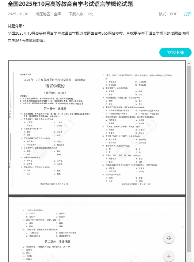 (https://www.zikao365.com/shiti/ ),输入科目名称即可获取,找到相应的试题,点击立即下载。