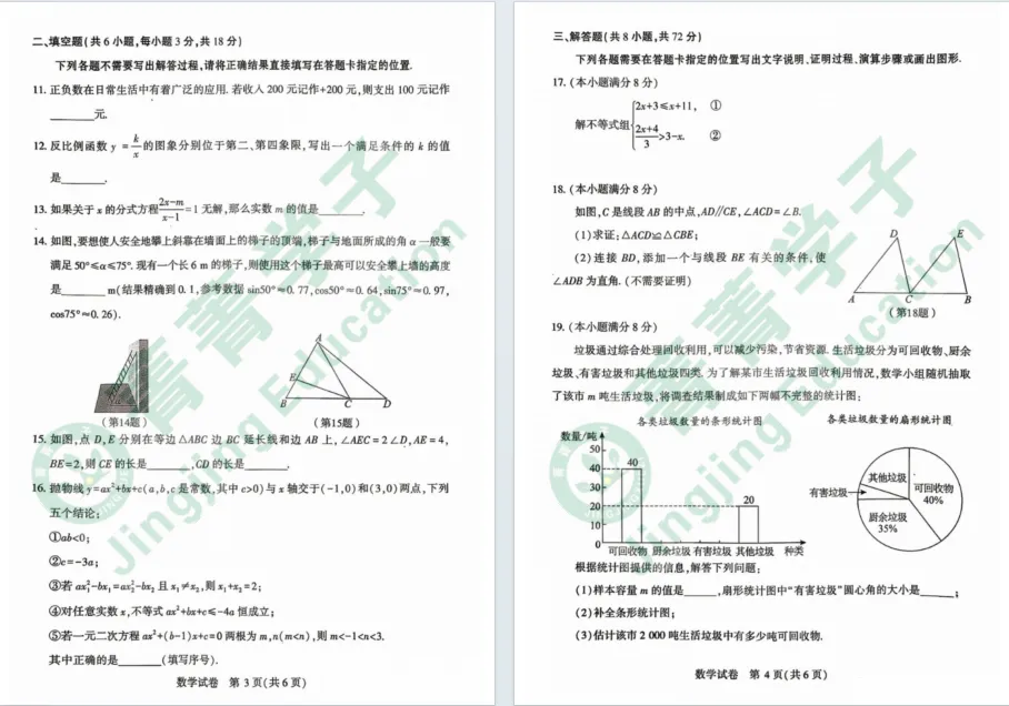 填空题11题考查正负数,12 题是数型结合的简单反比例函数题,13 题分式方程的化简,增根无解的情况,14 题解直角三角形,15题勾股与全等,2倍角应用,16 题数形结合的二次函数综合题
