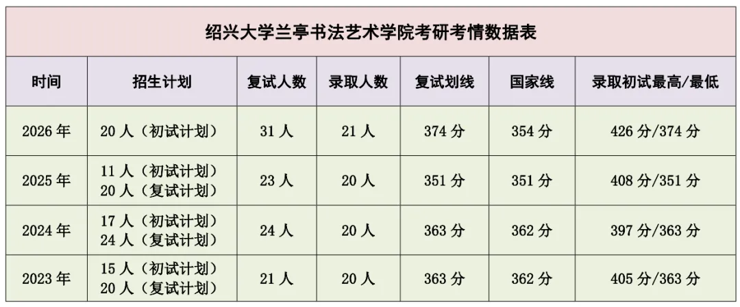 绍兴绍兴大学兰亭书法艺术学院招收美术与书法专业,书法创作与书法文化传播方向研究生。2026年招生计划20人,一志愿进入复试31人(鳳兮9人),复试线374分,拟录取21人(鳳兮6人),其中鳳兮书法考研马同学取得初试总分424分(第一),书法史论单科146分(第一),以下为鳳兮书法考研整理的相关资讯,供27年备考学生参考,本年度鳳兮书法考研开设书法史论全程课程(全程1700元 | 2027年鳳兮书法考研书法史论全程班招生简章(二战999元)),助力27年备考绍兴大学书法考研学子,详情请加微信咨询。