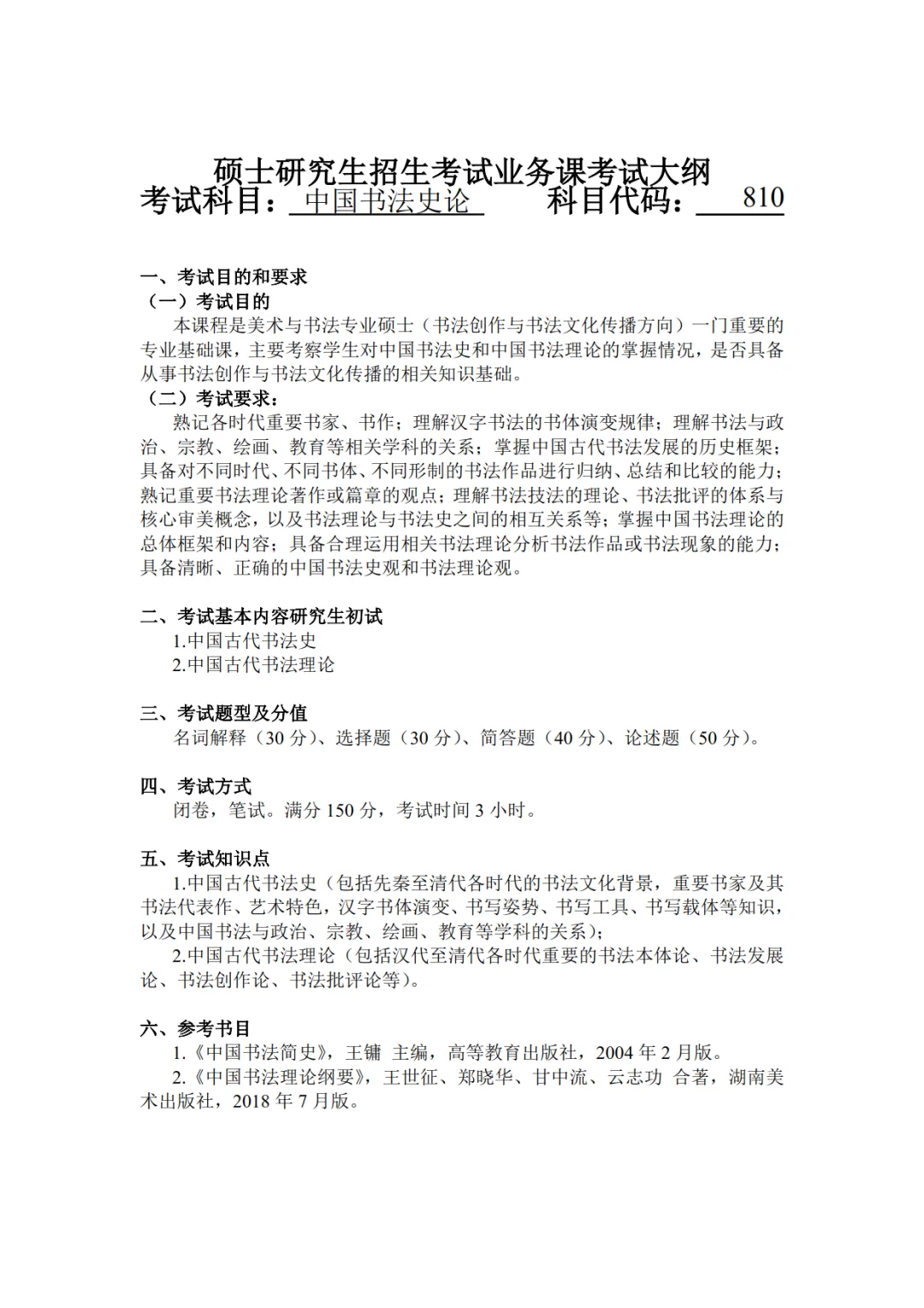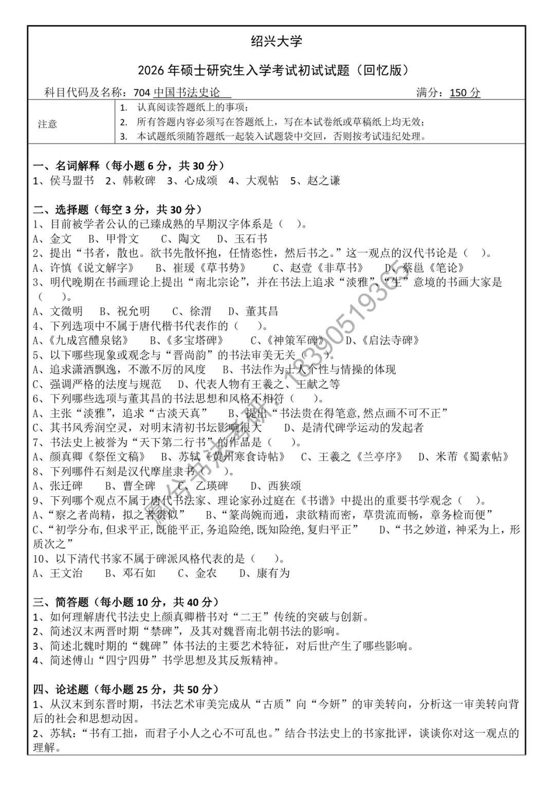 704中国书法史真题分析:名词解释(5个30分)都属于个案型命题:书家(赵之谦)、作品(侯马盟书、韩敕碑、大观帖)、理论著作(心成颂)都是书法史论中的一流考点,相对基础;选择题(10个30分)涉及书法史、书法理论中的概念、个案、现象等常规基础性考点;简答题(4个40分)涉及个案型(颜真卿的成就贡献)、现象型(“禁碑”的影响)、时代书体特征(魏碑体特征及影响)、主题思想类(“四宁四毋”)等题目类型。论述题(2个50分),属于史论结合型考题。第一题以书法理论中的“古质今妍”之论,分析审美转向出现的原因。第二题以苏轼“君子小人之论”(以人论书观),谈谈理解。这两个题目相对深入,但都属于书论中的经典之论,需以宏观视野,结合书法史进行论述。综合来看,绍兴文理学院该科目题量相对较大,考查偏重基础知识的掌握,需系统、全面的对书法史及书法理论进行深入复习。现将真题回忆版发布如下,供27年备考学生参考。