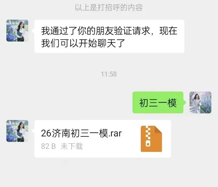 第二步:添加天天老师微信回复关键词“初三一模”即可获取期末资料文件夹,如下图所示👇