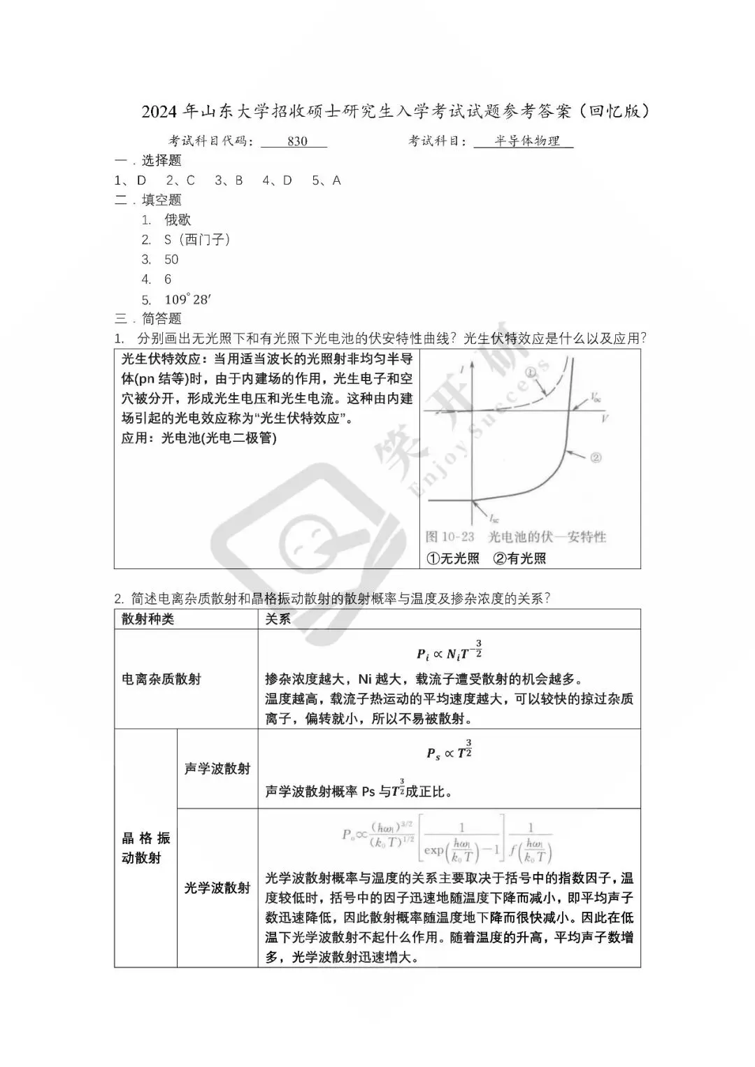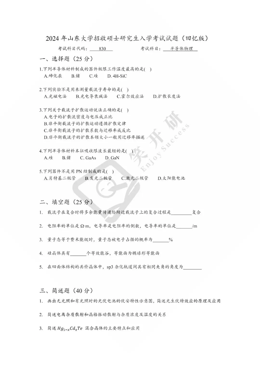 26考情分析|山东大学830半导体物理考研(集成电路科学与工程、集成电路工程、电子科学与技术、集成电路设计、集成微纳电子学)