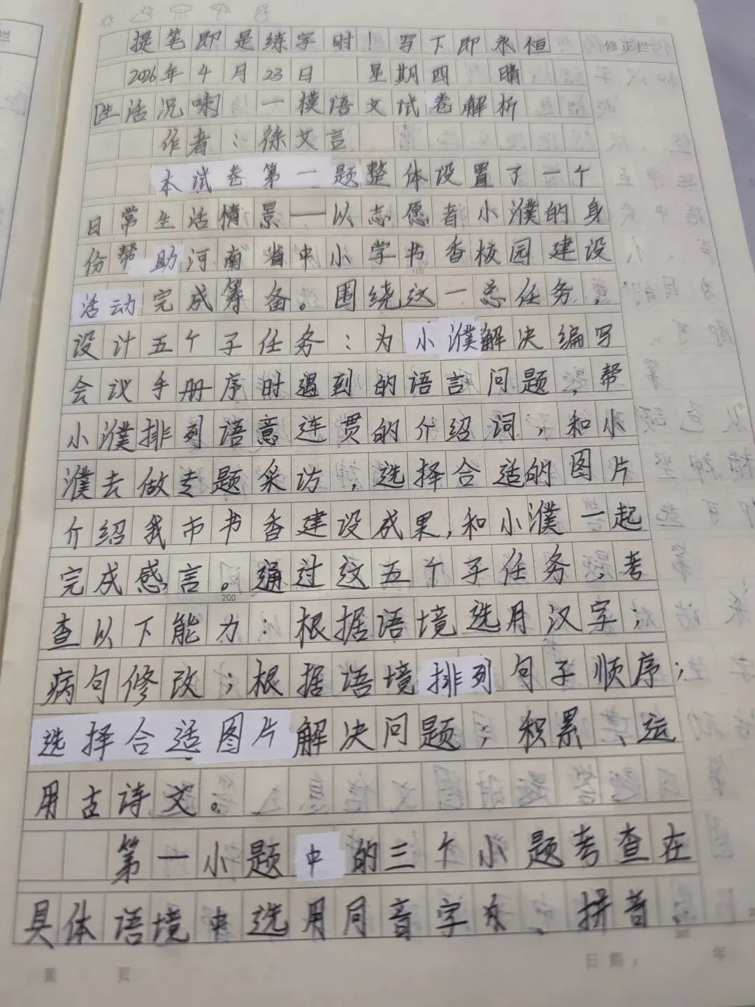 本试卷第一题整体设置了一个日常生活情景——以志愿者小濮的身份帮助河南省中小学书香校园建设活动完成筹备。围绕这一总总任务设计5个子任务:北小濮解决编写会议手册序时遇到的语言问题,帮小濮排列语言连贯的介绍词,和小濮去做专题采访,选择合适的图片介绍我市书香建设成果,和小濮一起完成感言。通过这5个子任务,考察一下能力:根据语境选用汉字,并去修改;根据语境排列句子顺序;选择合适图片解决问题;积累运用古诗文。