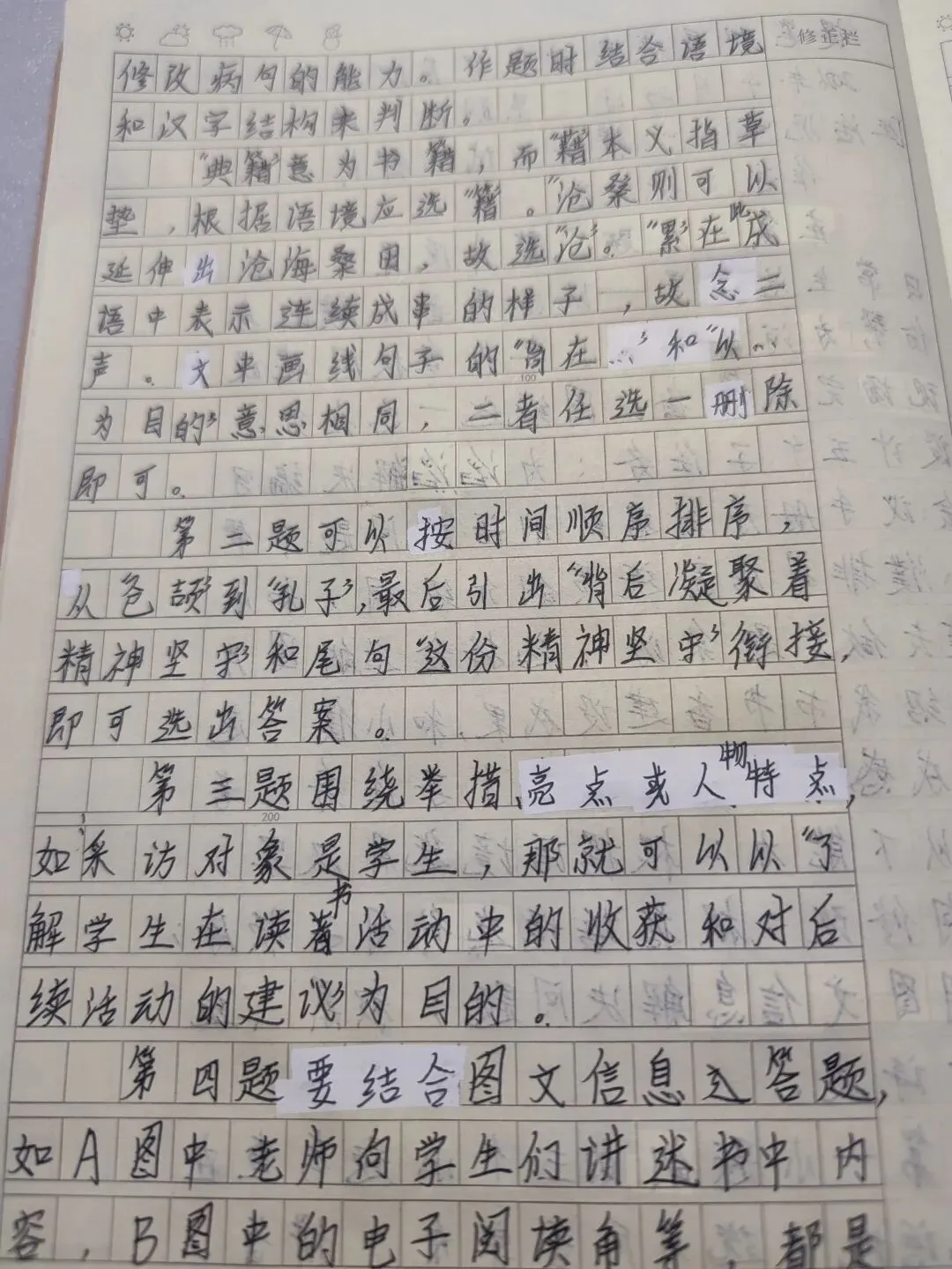 第四题要结合图文信息答题,如A图中老师向学生们讲述书中的内容,B图中的电子阅读角等,都是摆在眼前的答案。