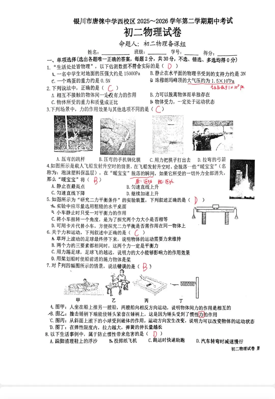 考后分析:这份试卷是典型的期中阶段性检测卷,整体难度中等,命题严格围绕人教版八下教材前半学期内容,以基础概念、生活应用、实验操作、规范计算为核心,无偏题、怪题、超纲题,重点考查学生对物理原理的理解与简单应用能力。