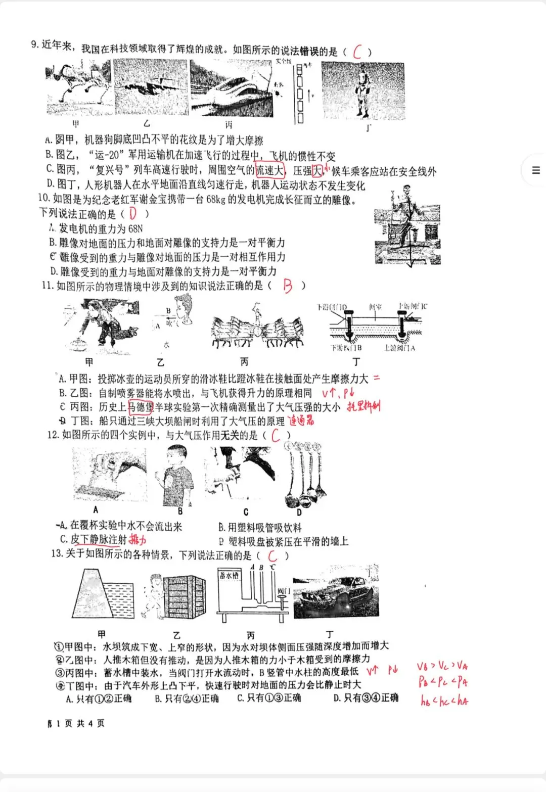 选择题全部以生活场景、科技实例、课本原图为载体,考查对物理概念、规律的辨析与判断,几乎不涉及复杂计算,侧重 “懂不懂、记没记、会不会区分”。考点覆盖力的基本概念、牛顿第一定律、二力平衡、惯性、摩擦力、固体压强、液体压强、大气压强、流体压强与流速关系、连通器等全部核心知识点。