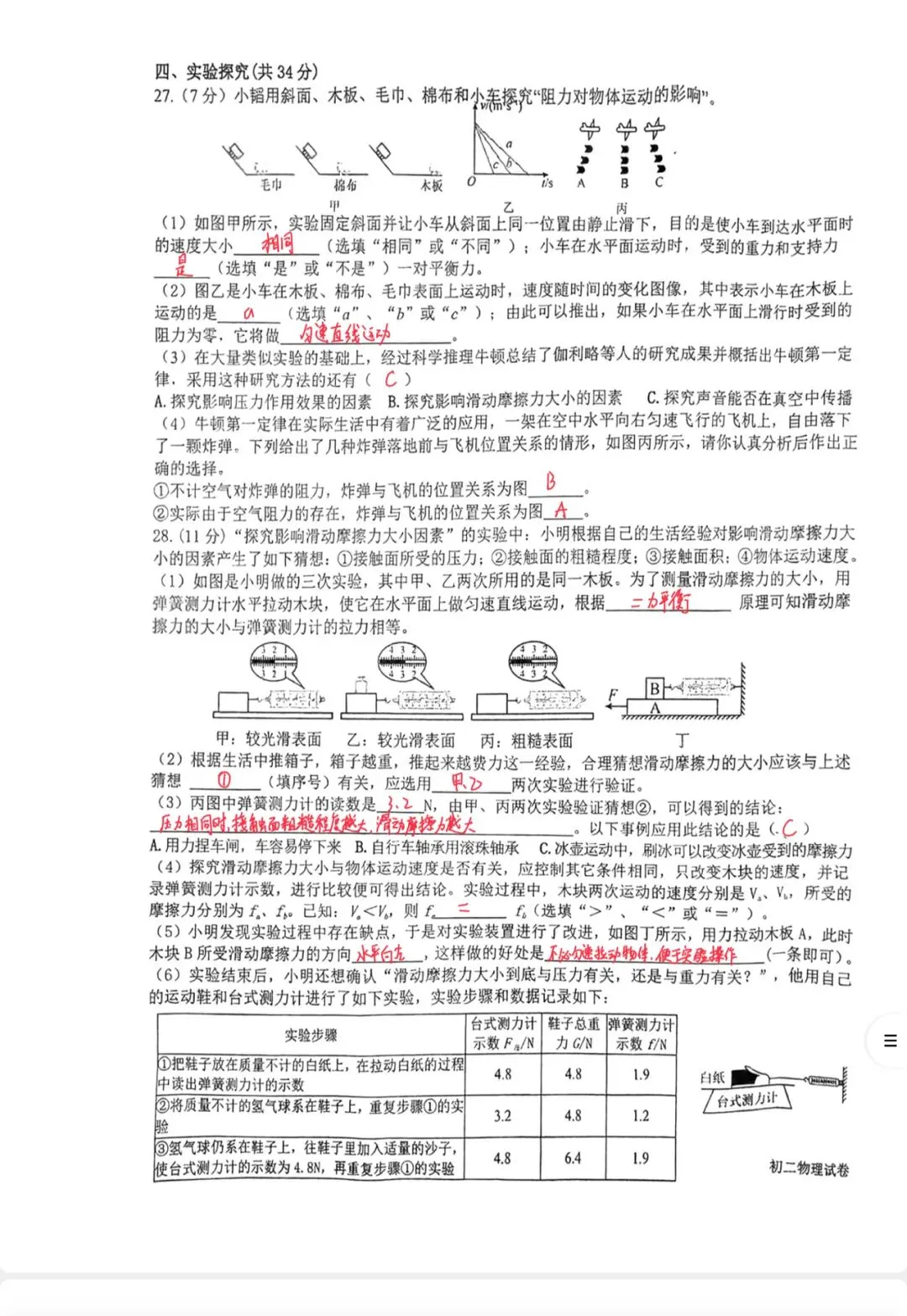 实验题分值最高,是全卷重点,完全覆盖人教版八下4 个必做核心实验,侧重考查实验目的、操作方法、控制变量、转换法、科学推理、实验改进、结论表述,强调 “做过实验、懂实验”,而非死记硬背。