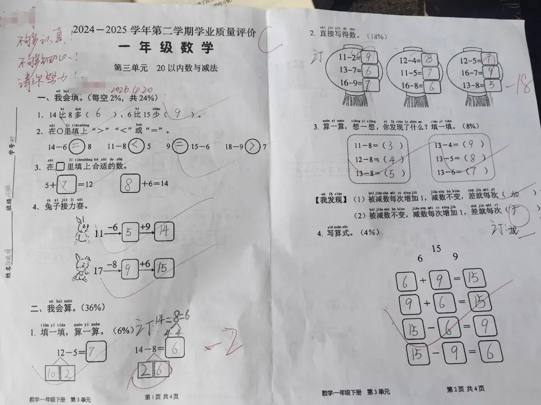 100分的卷子,知识点是20以内的加减法,考了73分。