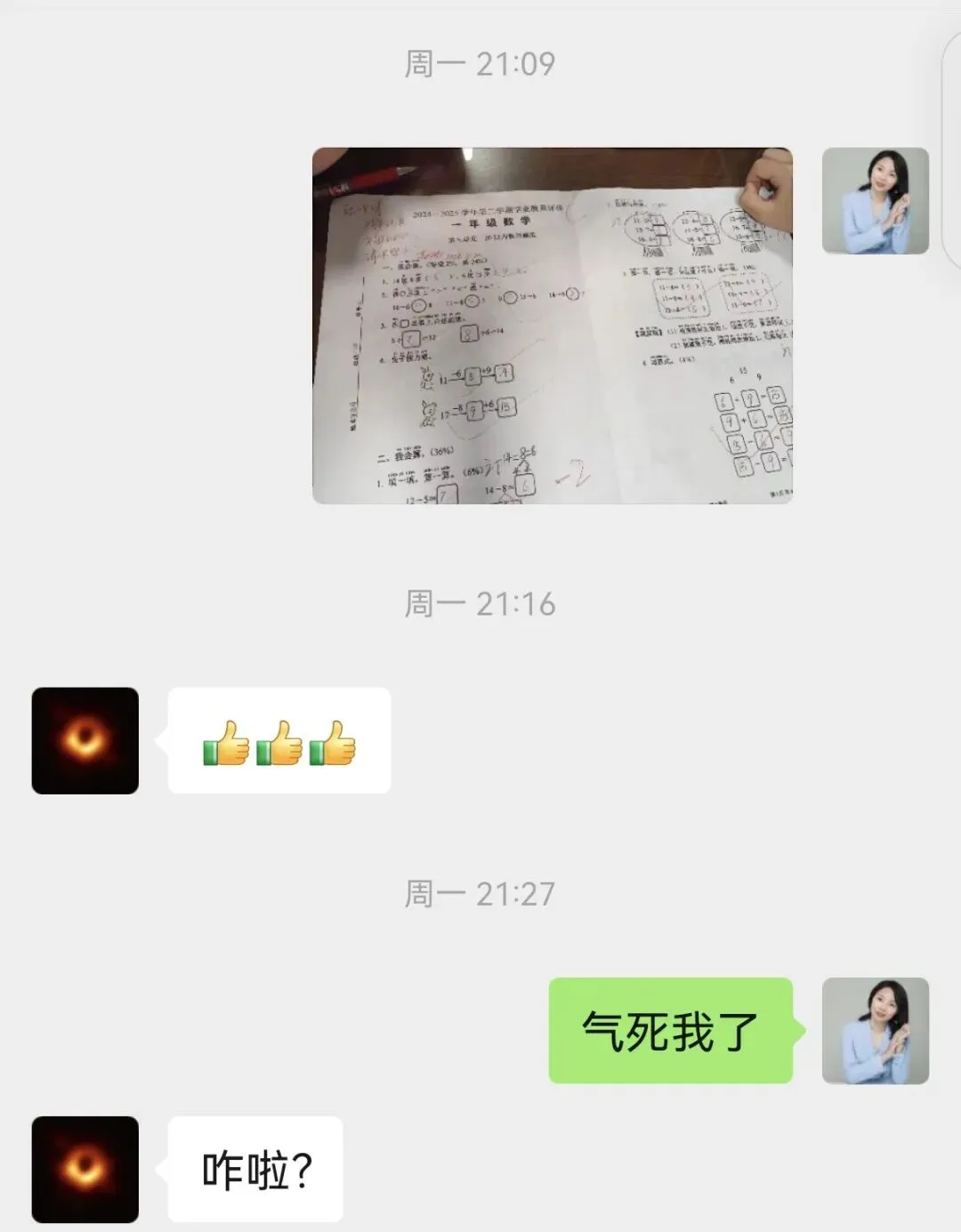 数学老师正在上晚修,竟然给我回了三个大拇指。真的让我“竟无语凝噎”。