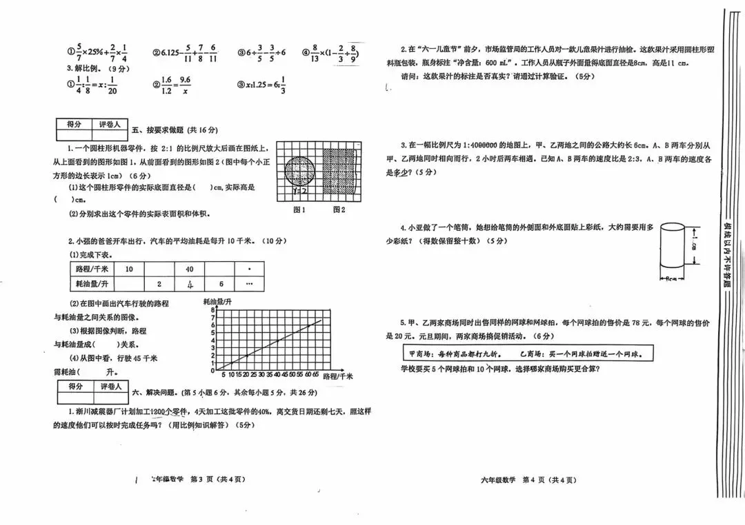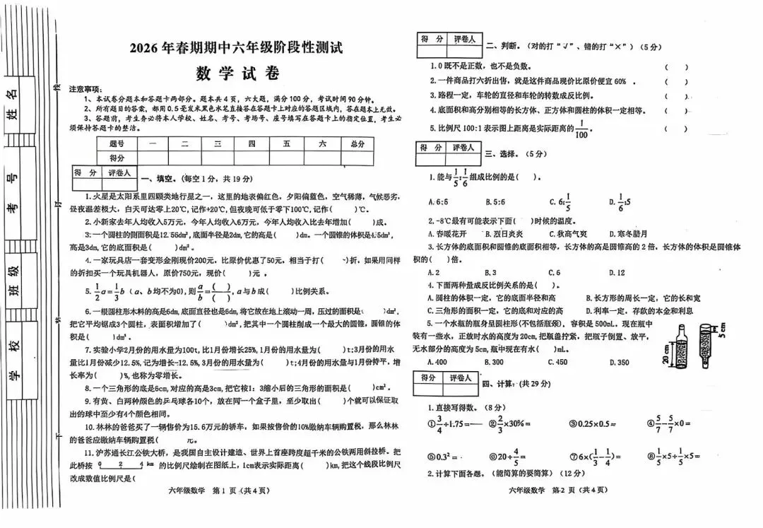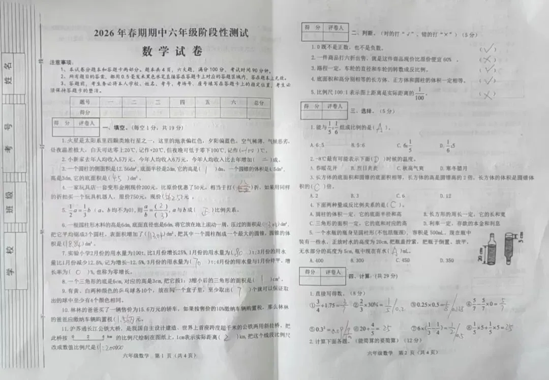 2026六年级(下)期中数学素养测评试卷