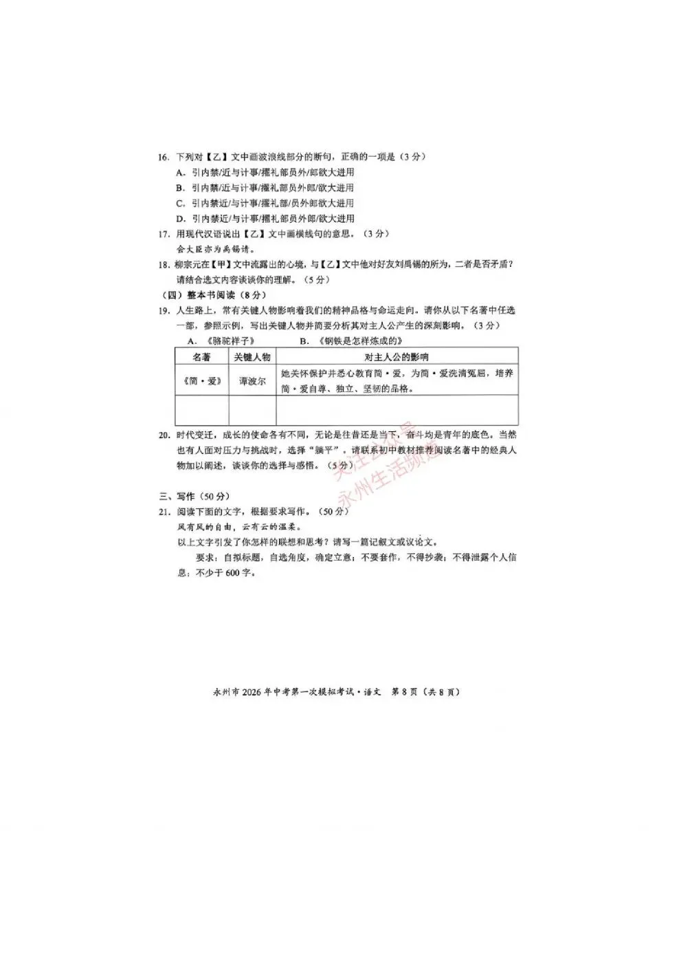 永州市2026年中考模拟考试数学、语文试卷