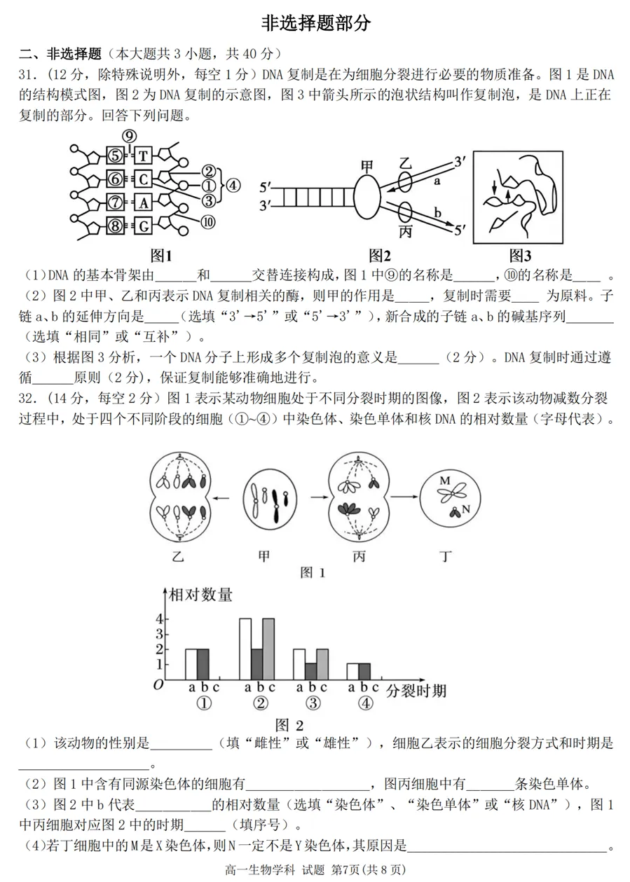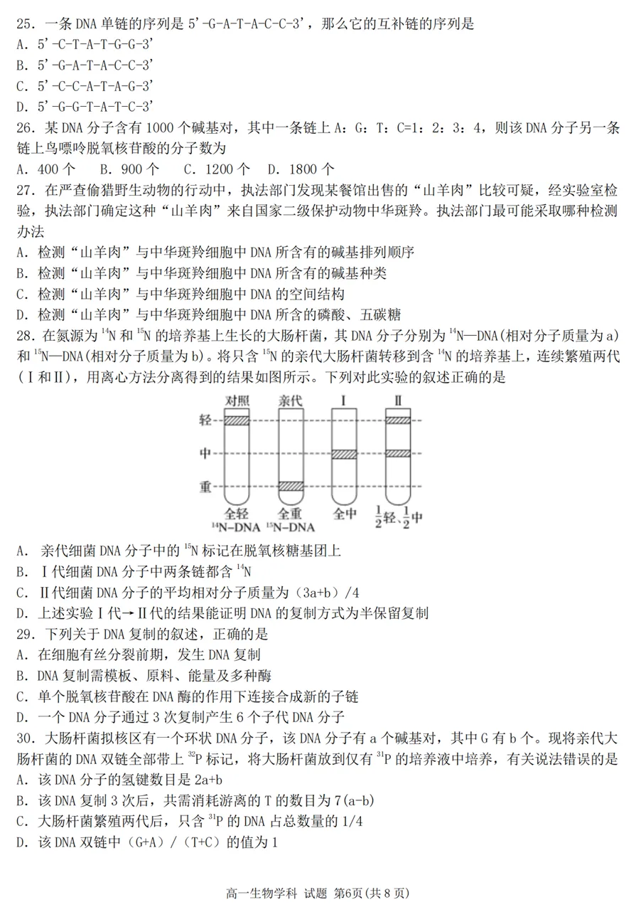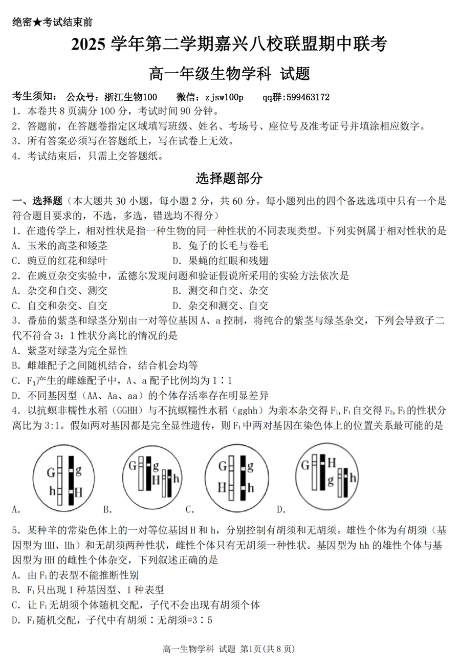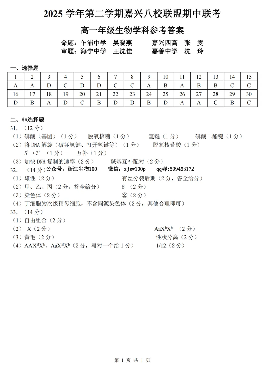 2025年4月浙江各地市高一期中生物试卷答案汇总,可下载!