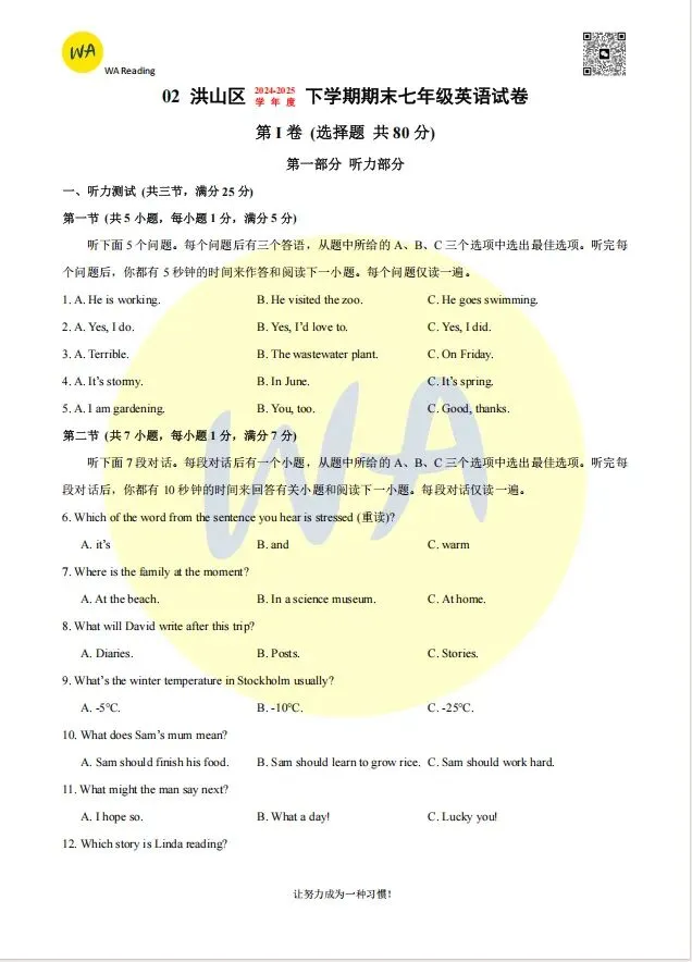2024-2025年洪山区七下期末试卷