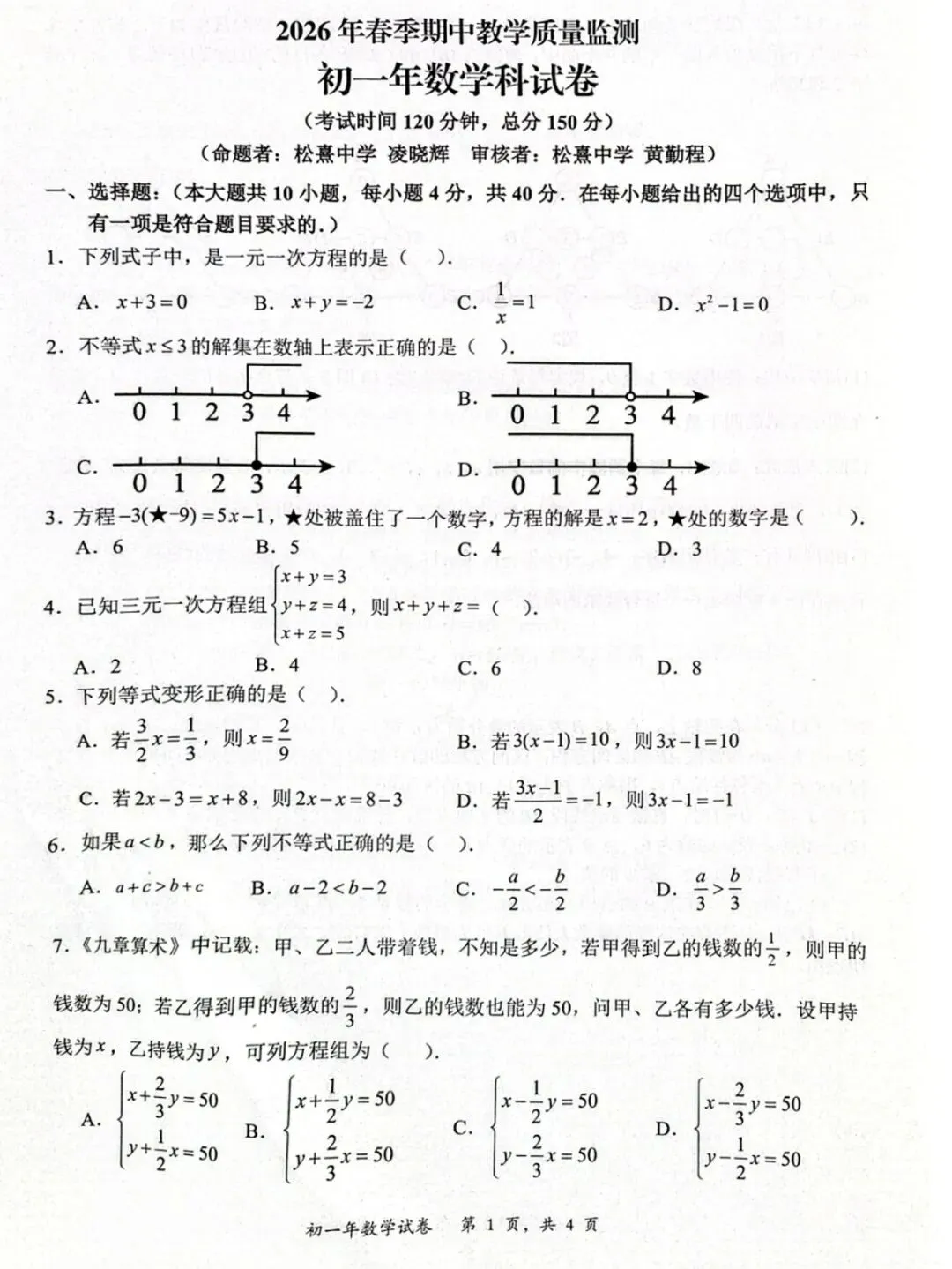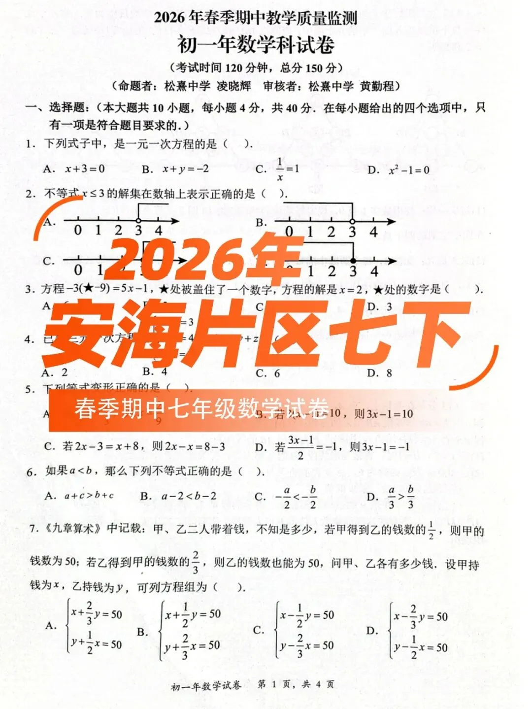 >【晋江安海片区】春季期中七年级数学试卷
