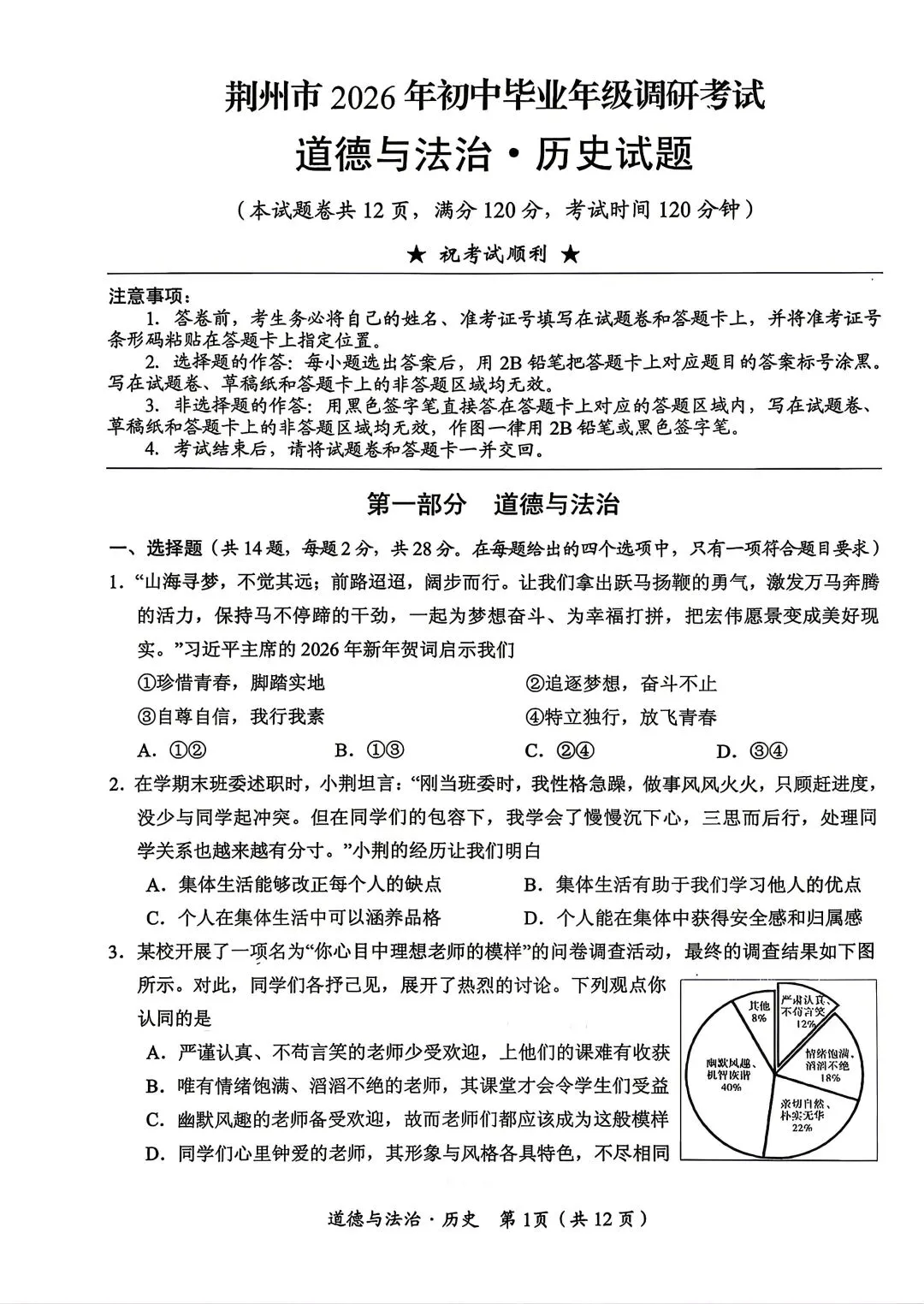 政治最新!9下26年湖北省荆州市二模政治及答案