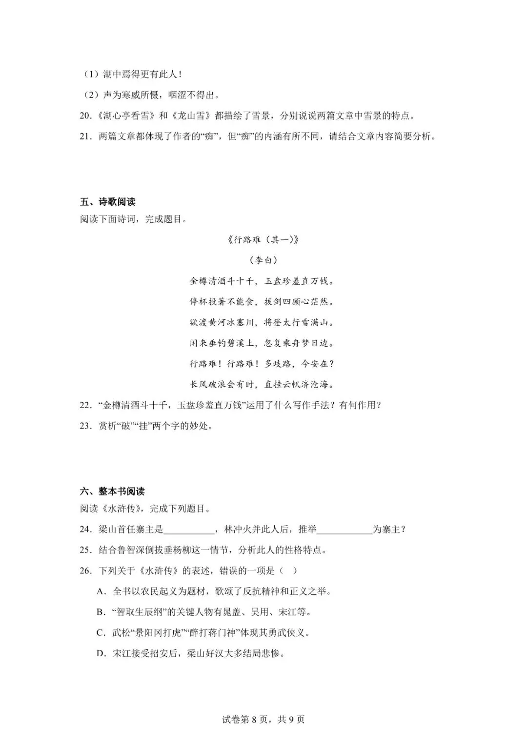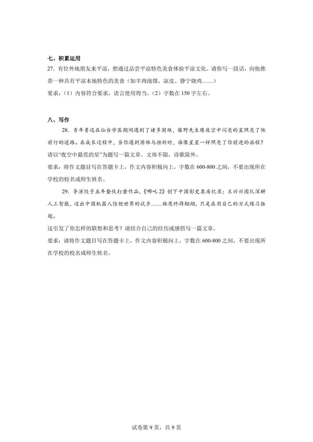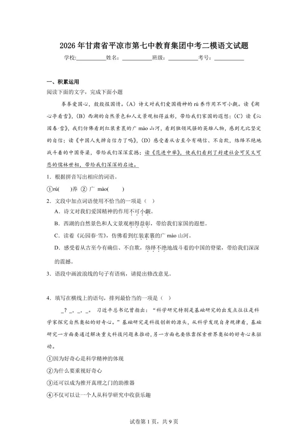 最新!9下26年湖北省荆州市二模各科试卷及答案