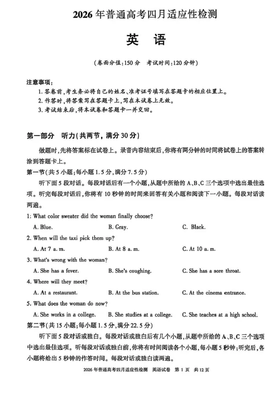 >【高三试卷】新疆2026届高三下学期四月适应性检测(全科)