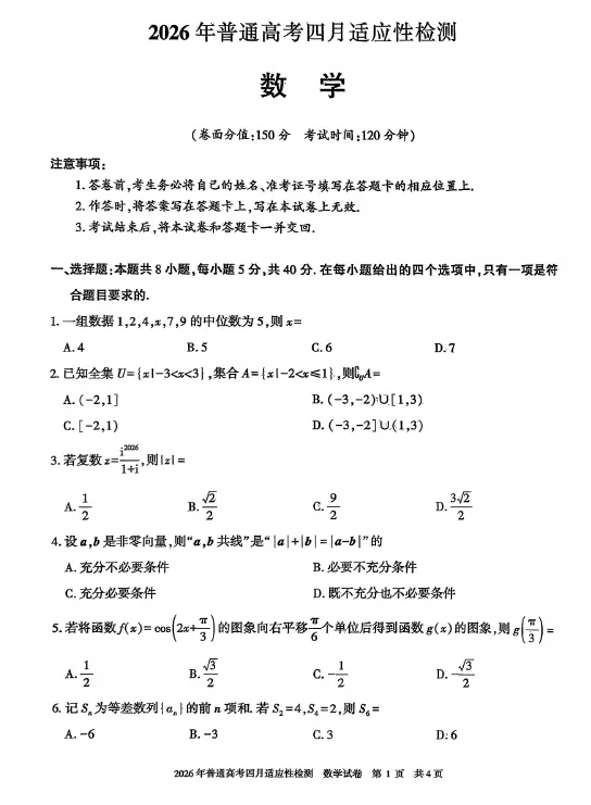 【高三试卷】新疆2026届高三下学期四月适应性检测(全科)