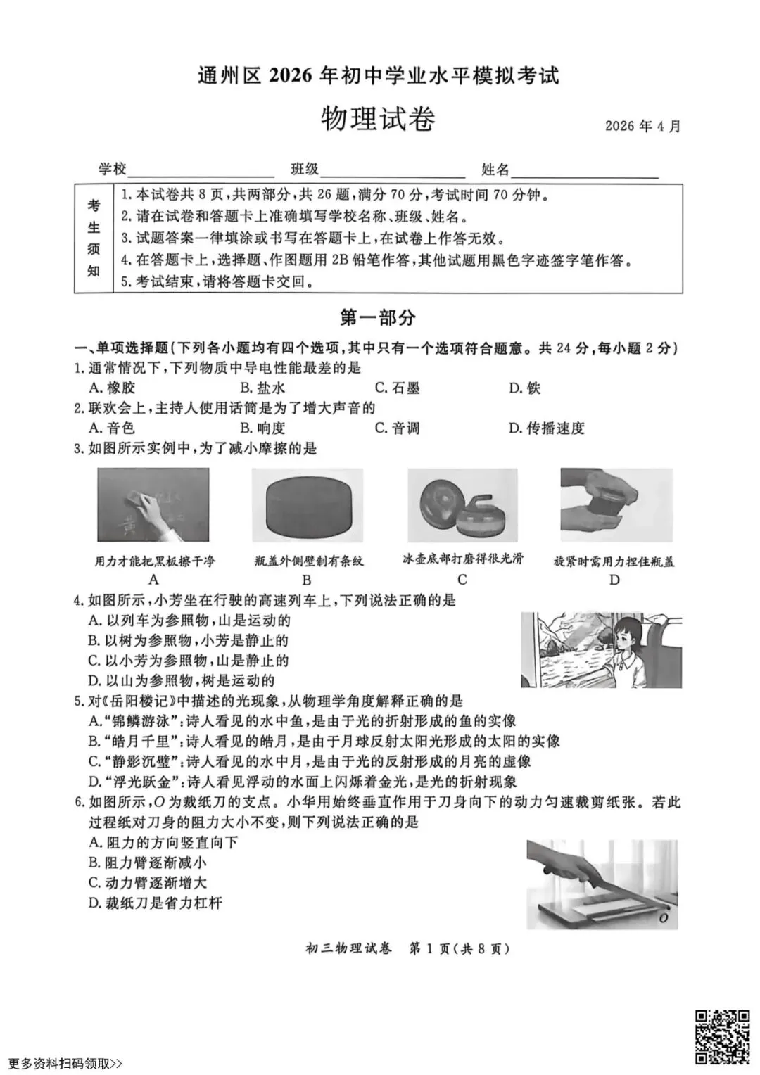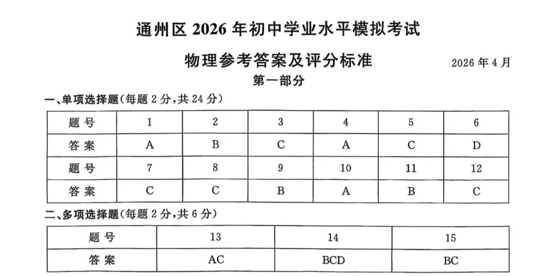 今天给大家分享的是2026北京通州初三一模物理试卷(含答案),其他区域或学校的学生都可以练一练。近期会持续分享,欢迎大家多多关注,也可以把我们分享给更多人哦。