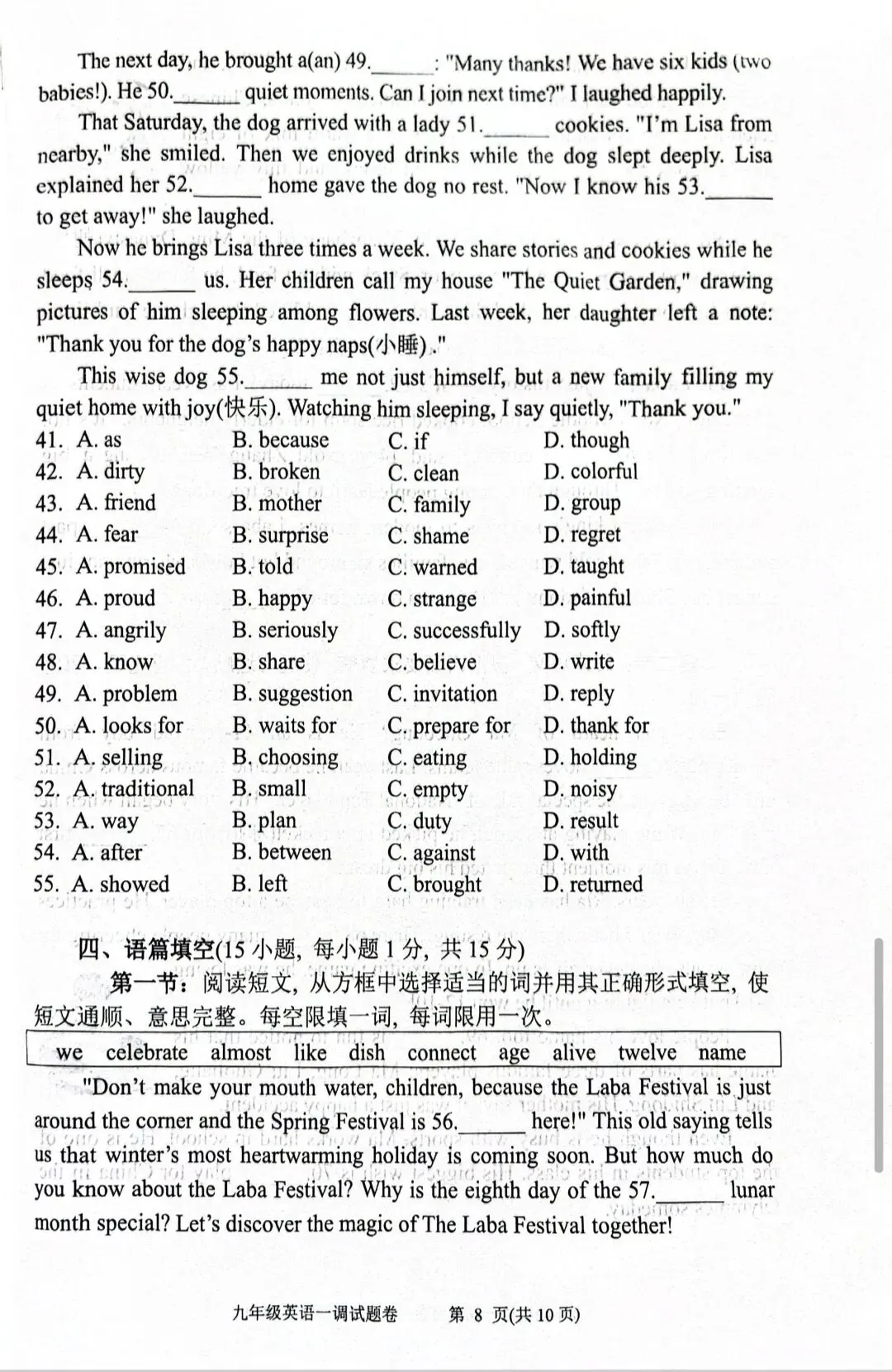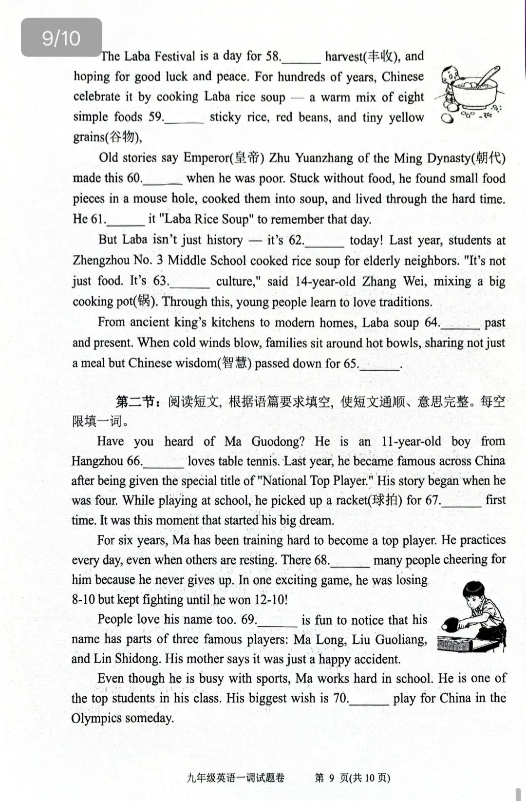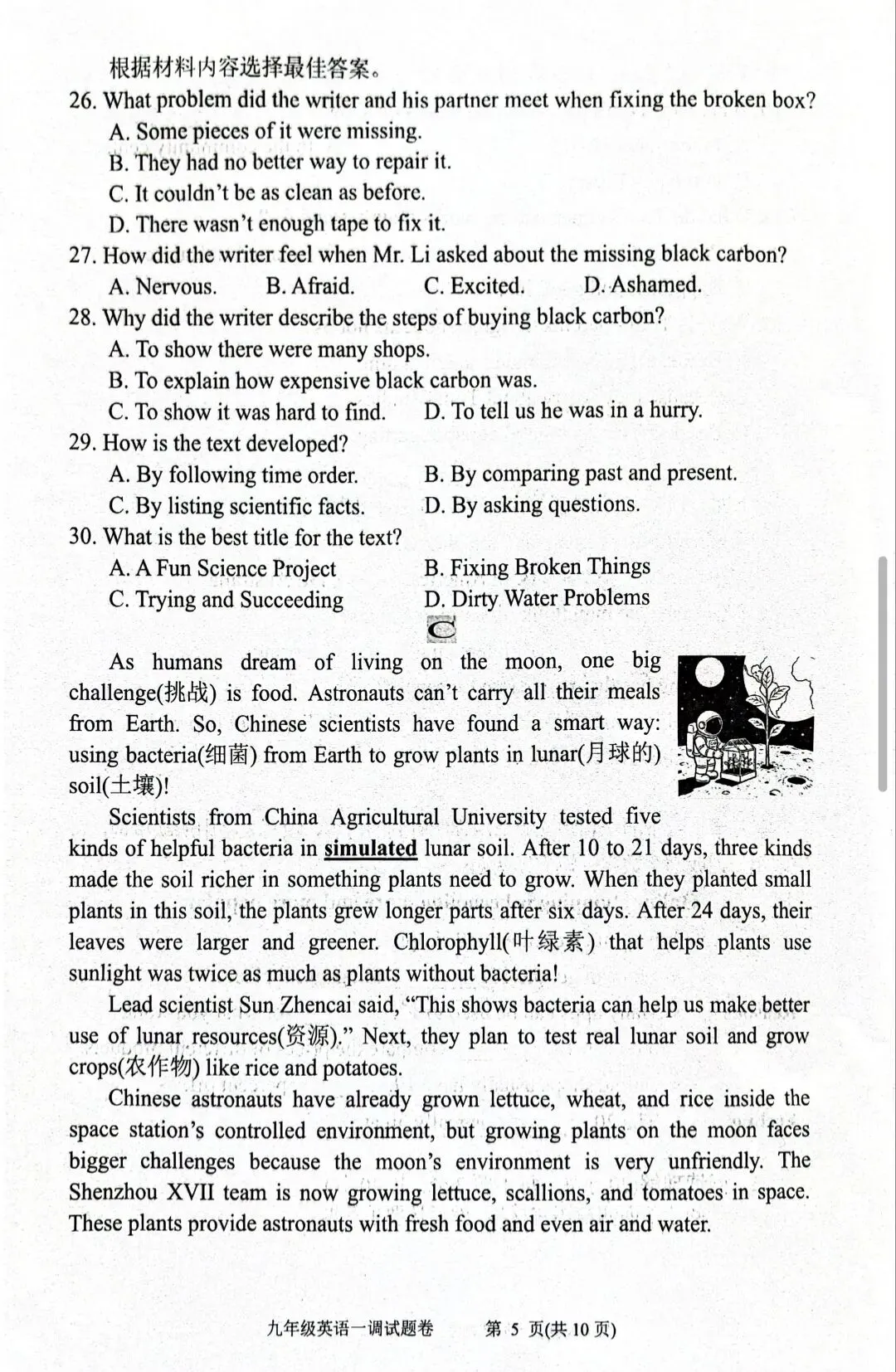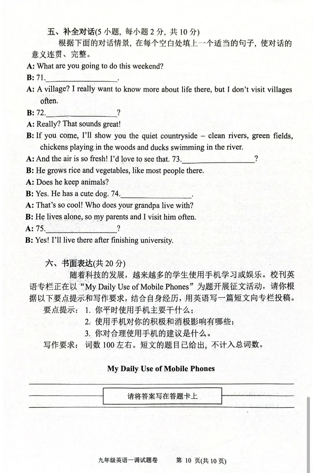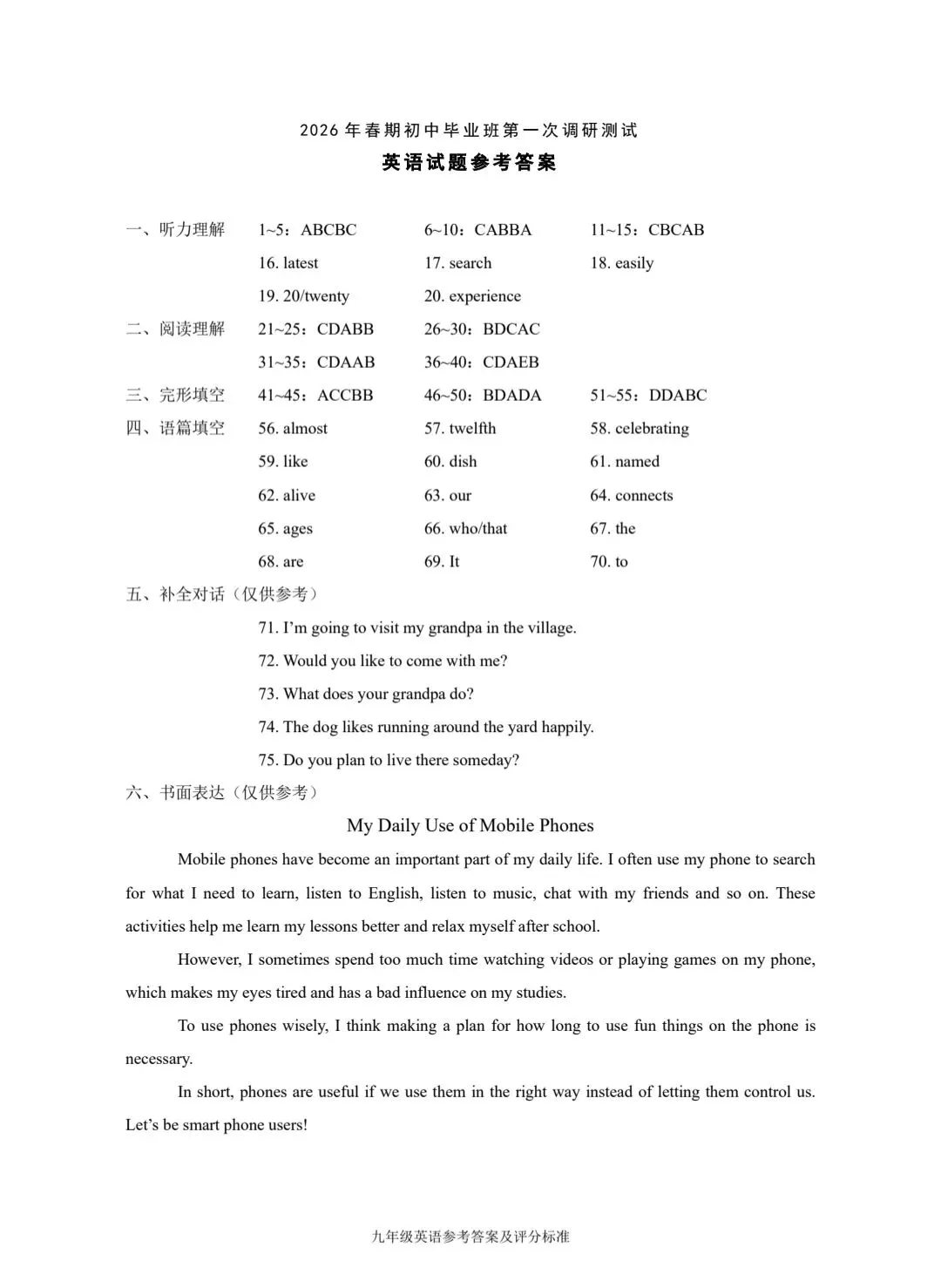 >2026年春期九年级英语一模试卷(附答案、补全、作文评价标准)