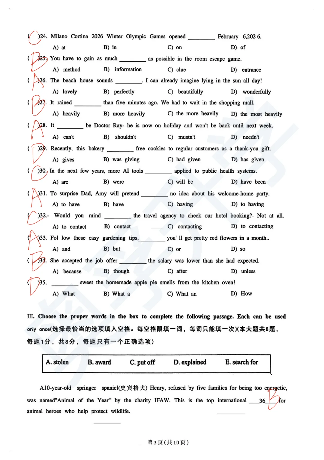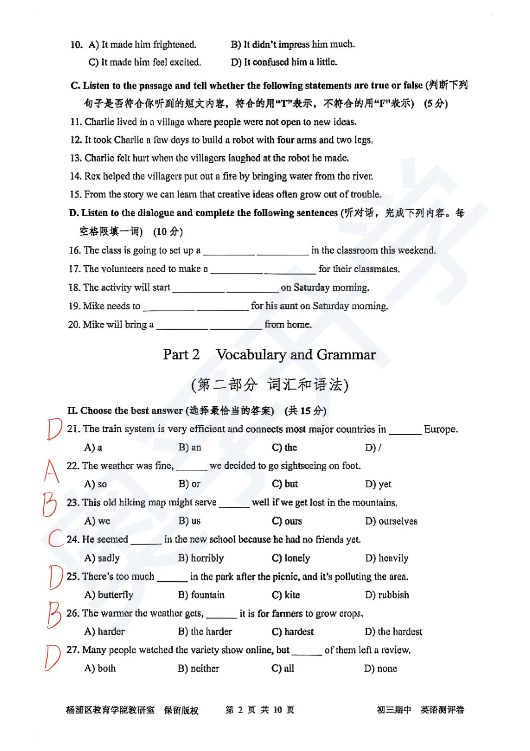 对答案!最全2026中考二模10区试卷&答案!<杨浦/闵行/静安/虹口/徐汇等>