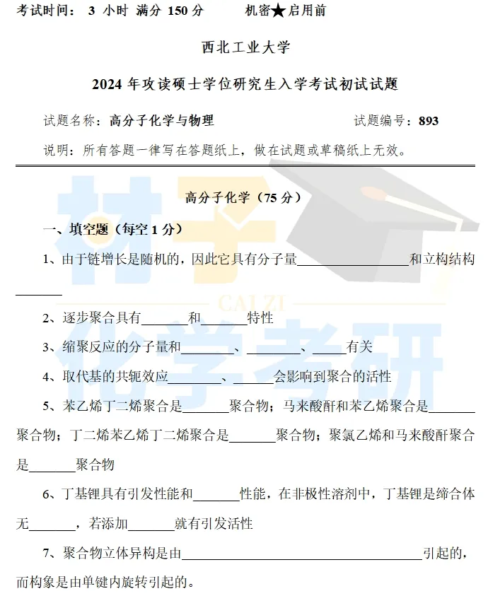【考研真题】2024年西北工业大学(893高分子化学与物理)真题公布