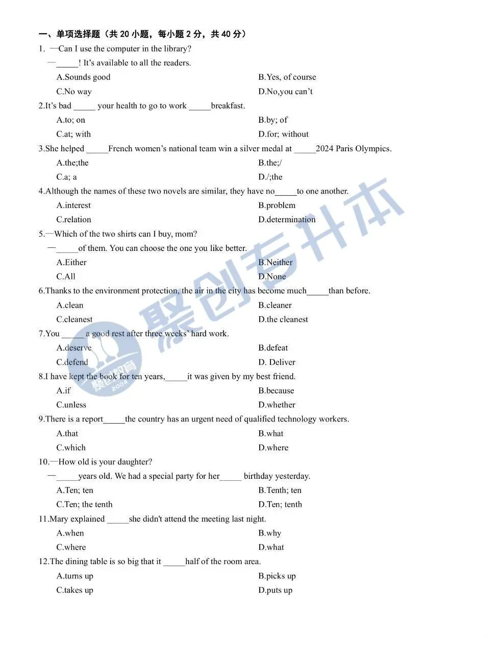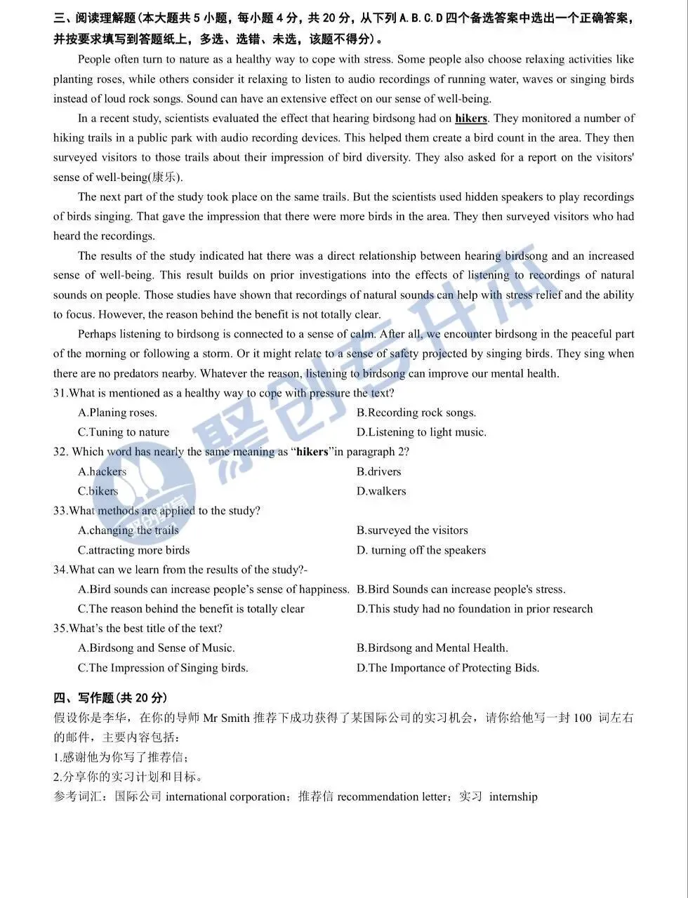 秦淮区 初三一模英 语试卷