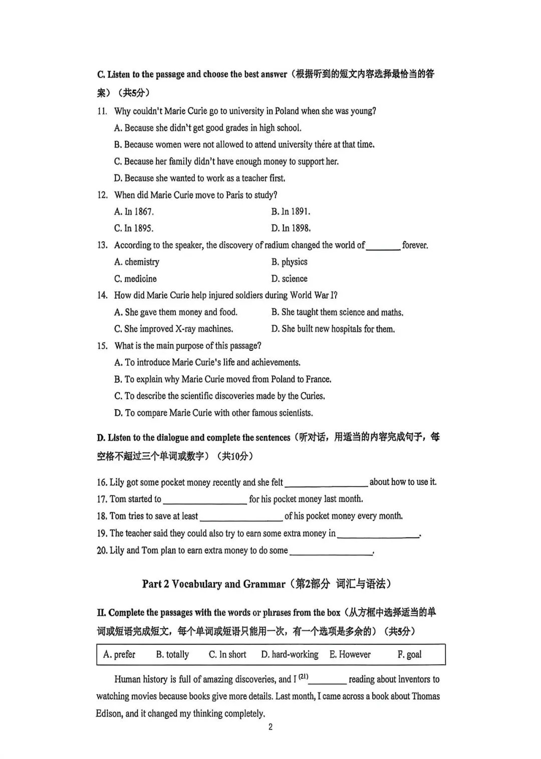 >上海市杨浦区八年级第二学期英语期中试卷(2026.4)