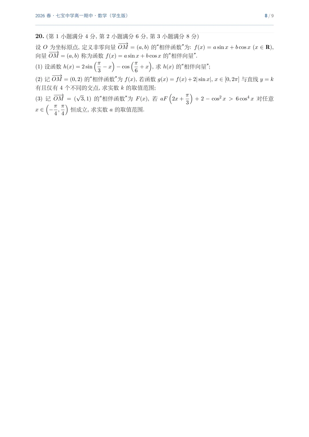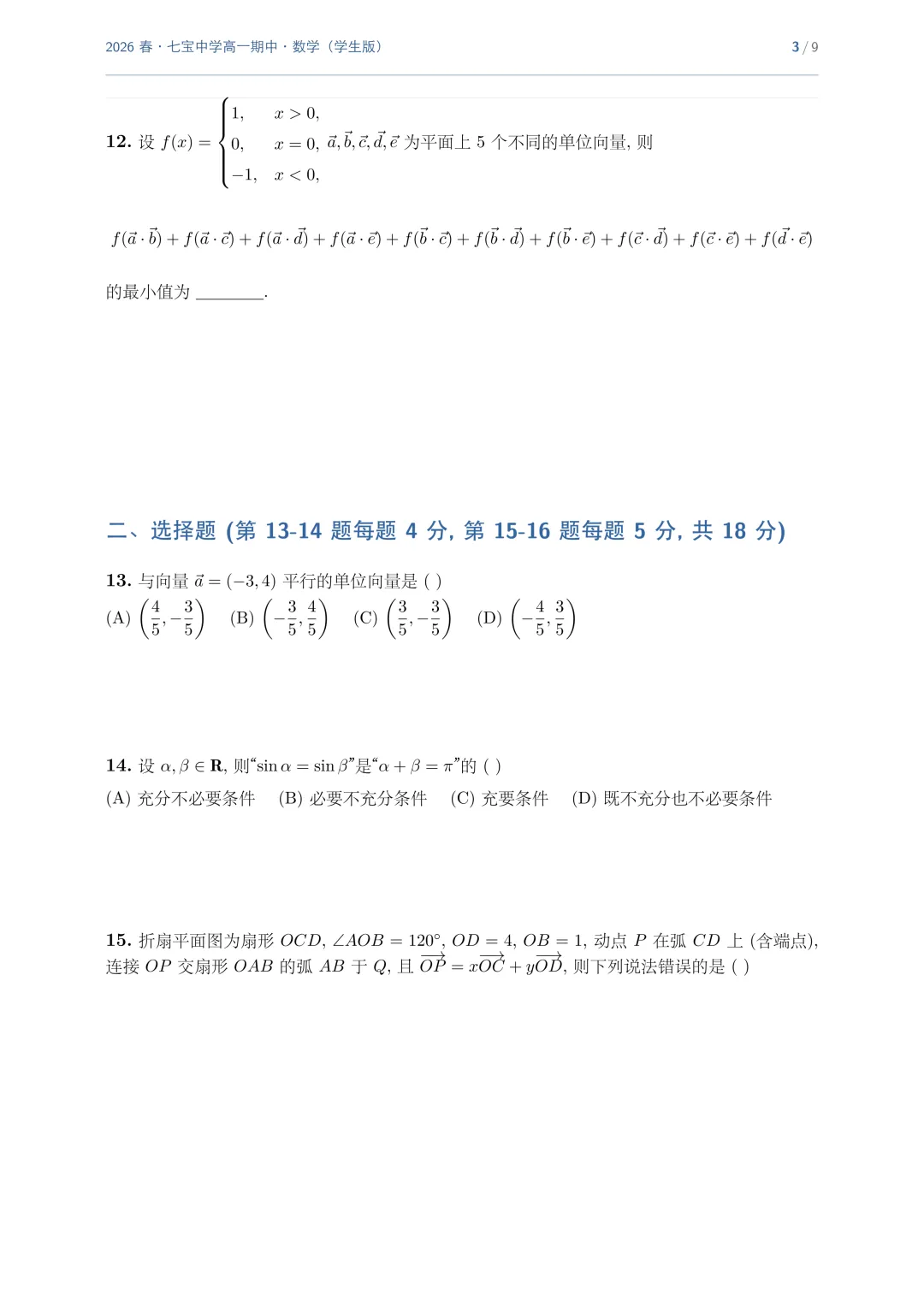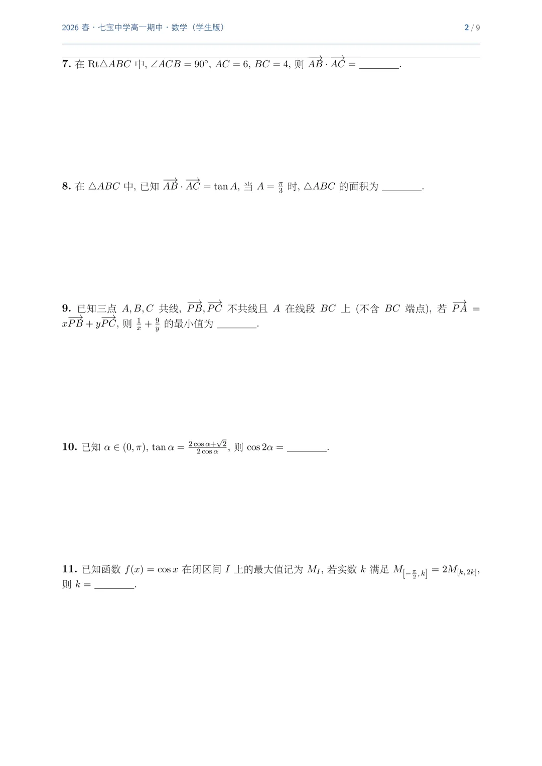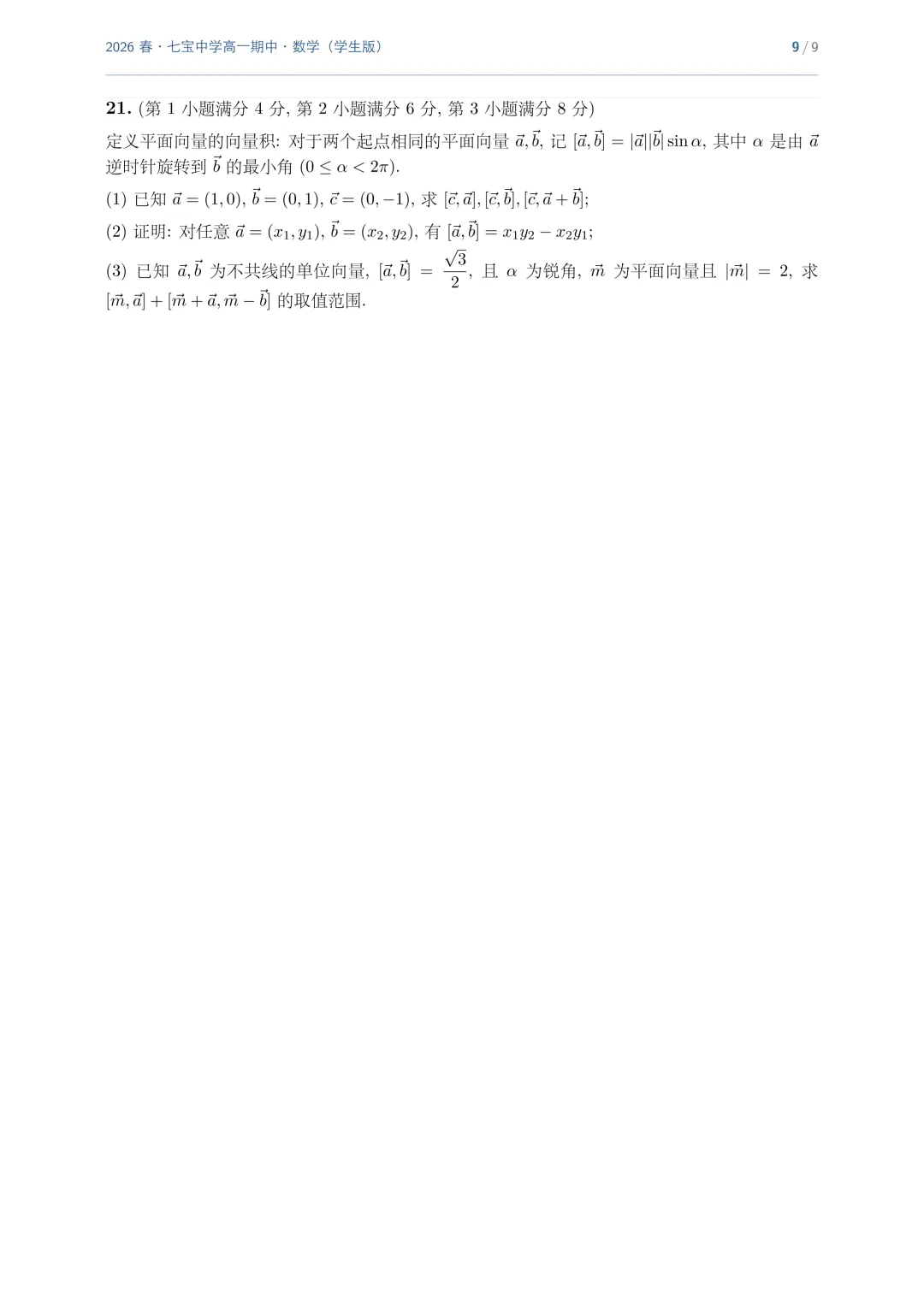>上海市七宝中学高一数学期中试卷(2026.4)
