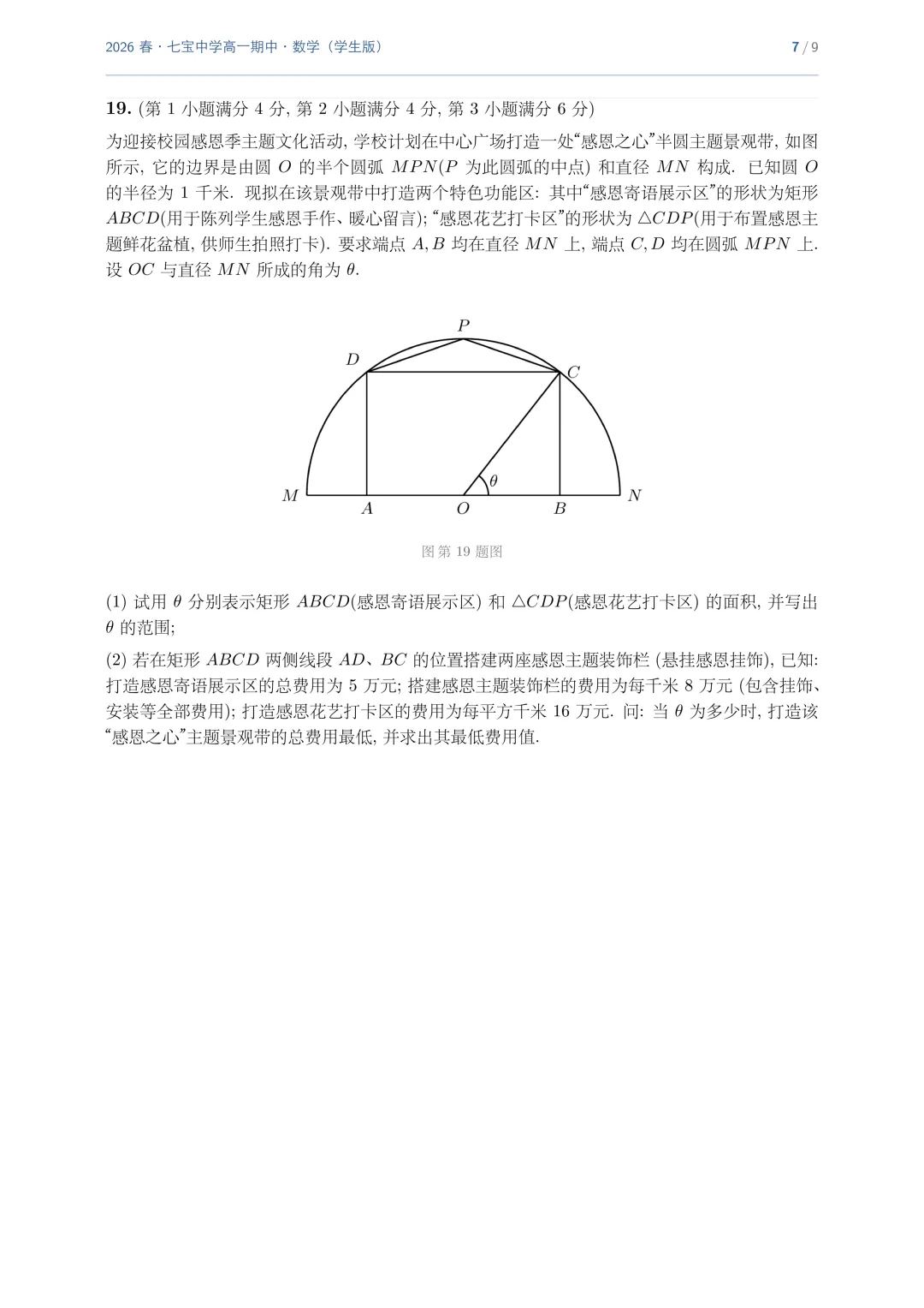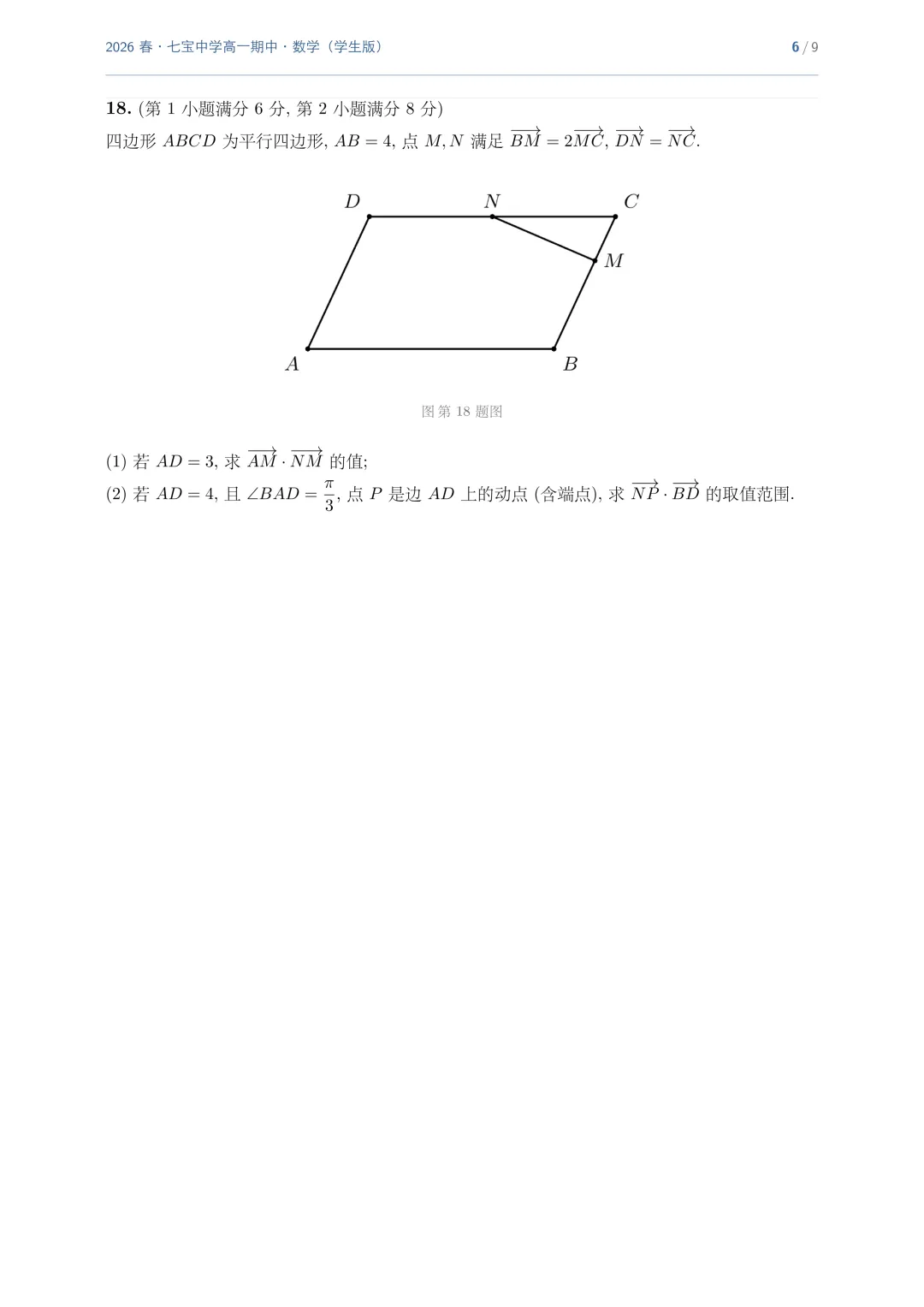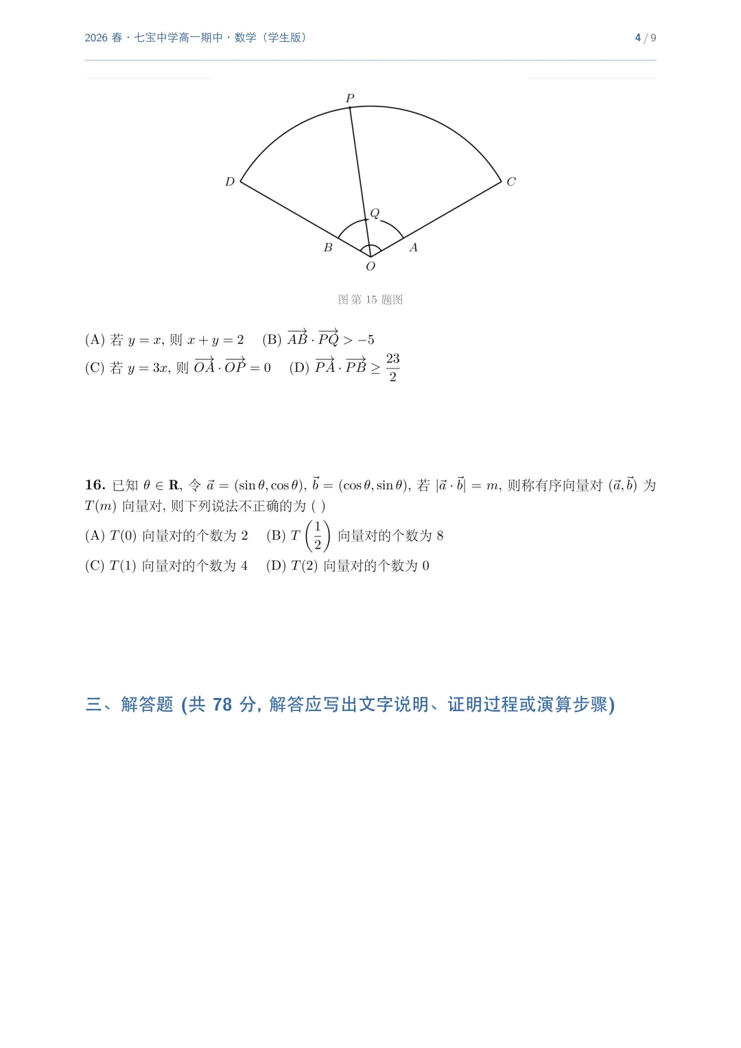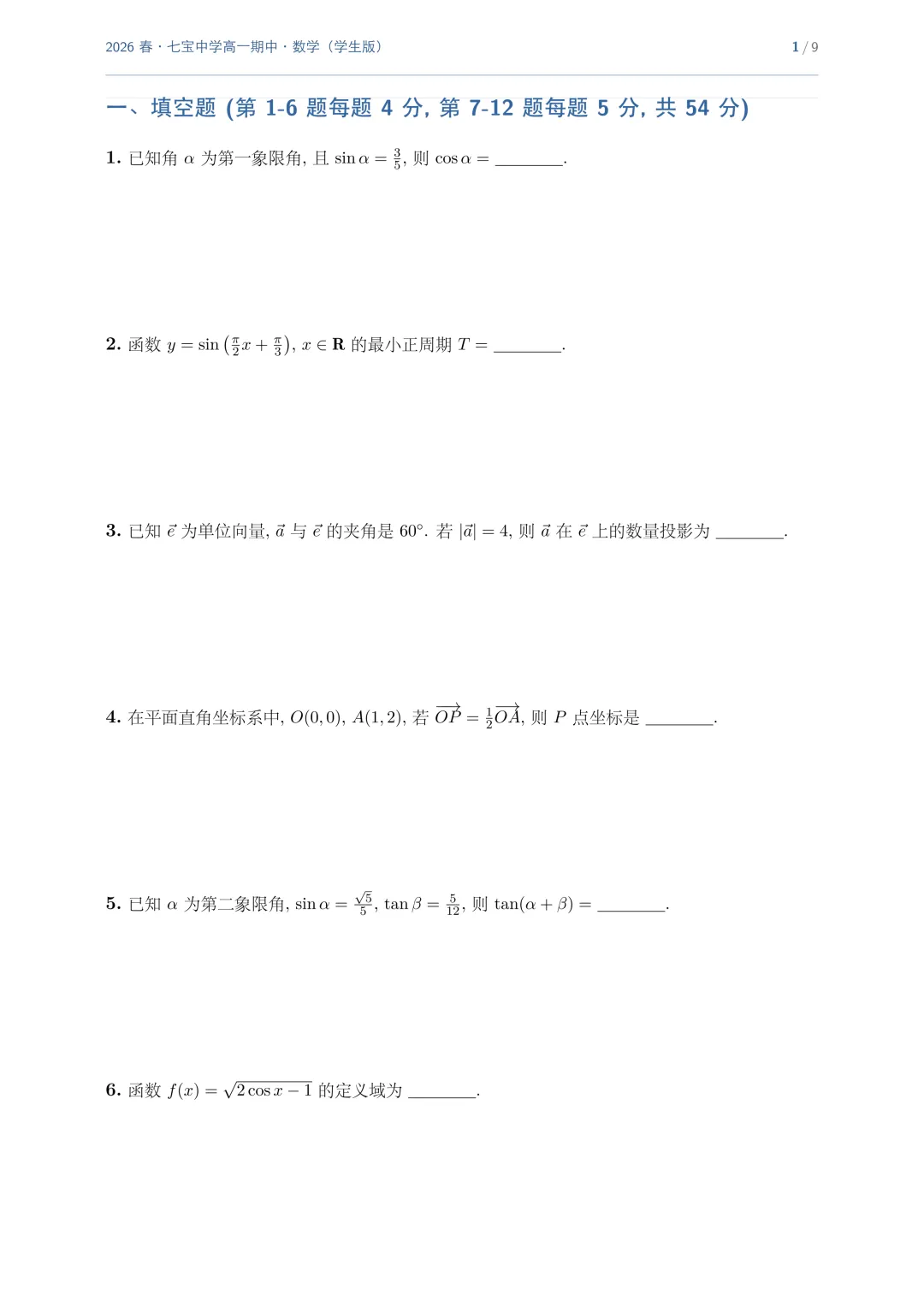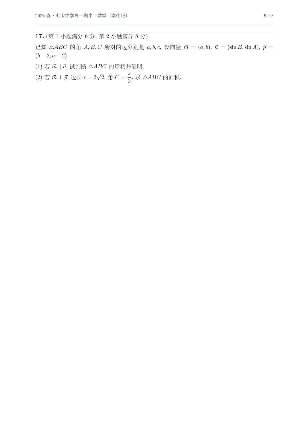 >上海市七宝中学高一数学期中试卷(2026.4)