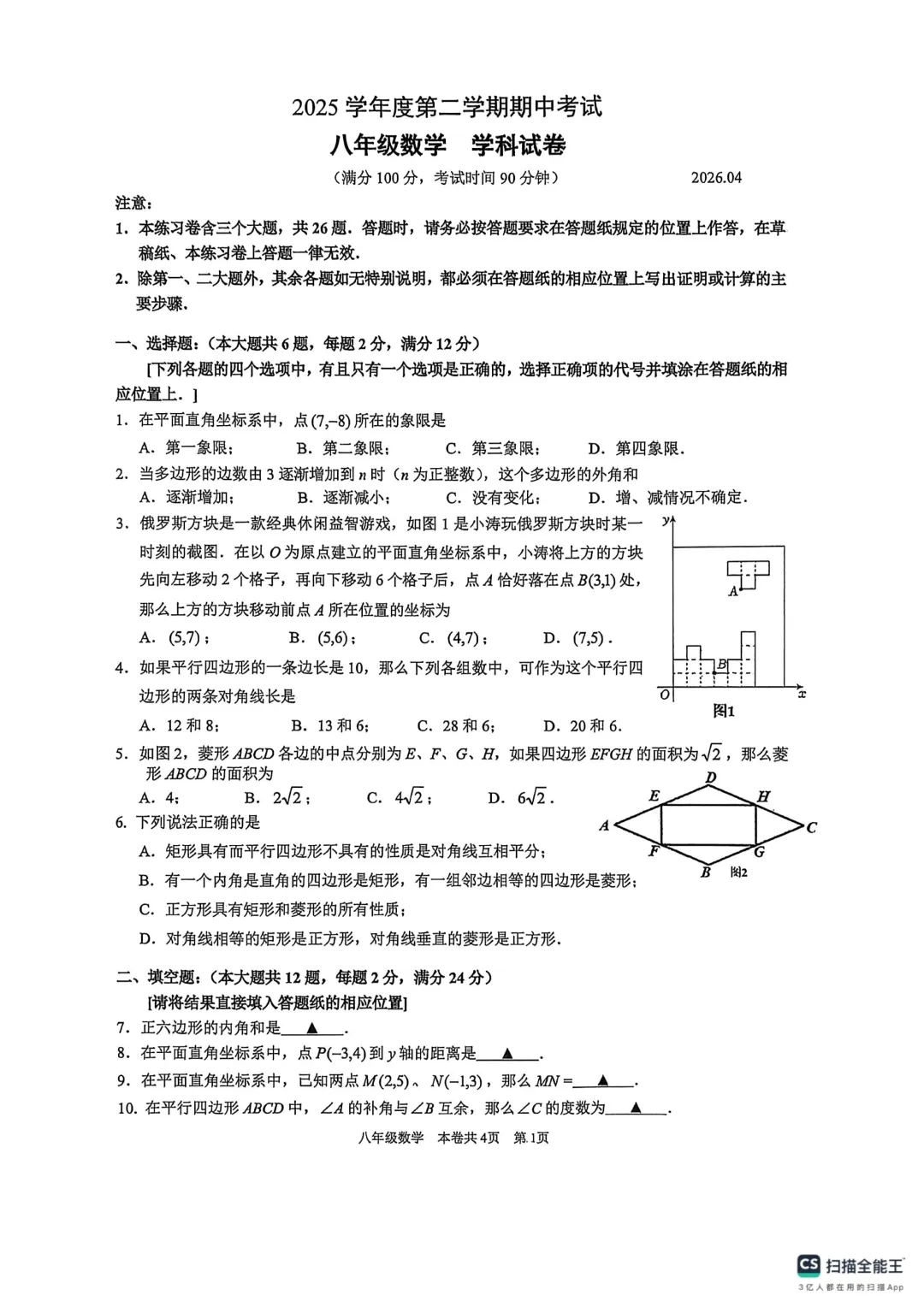 >上海市虹口区八年级数学期中试卷及答案(2026.4)