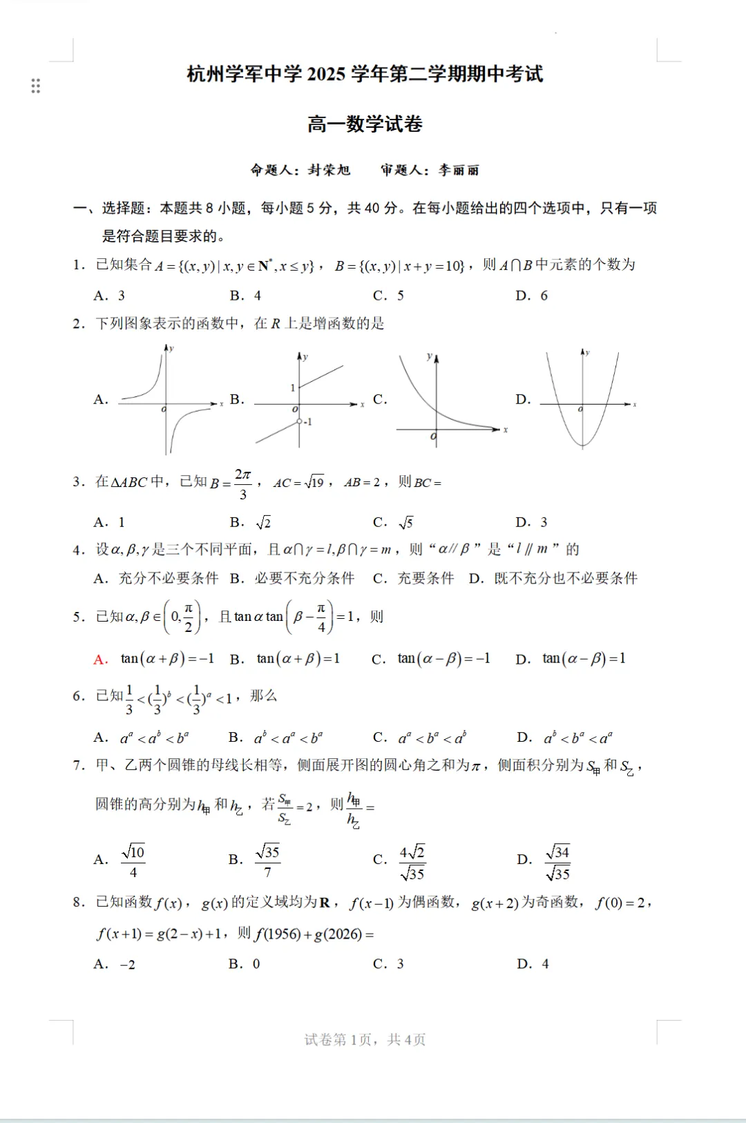 有需要的朋友请及时下载,7天内有效,我用夸克网盘给你分享了「学军中学2026年高一下期中数学试卷.docx」,点击链接或复制整段内容,打开「夸克APP」即可获取。