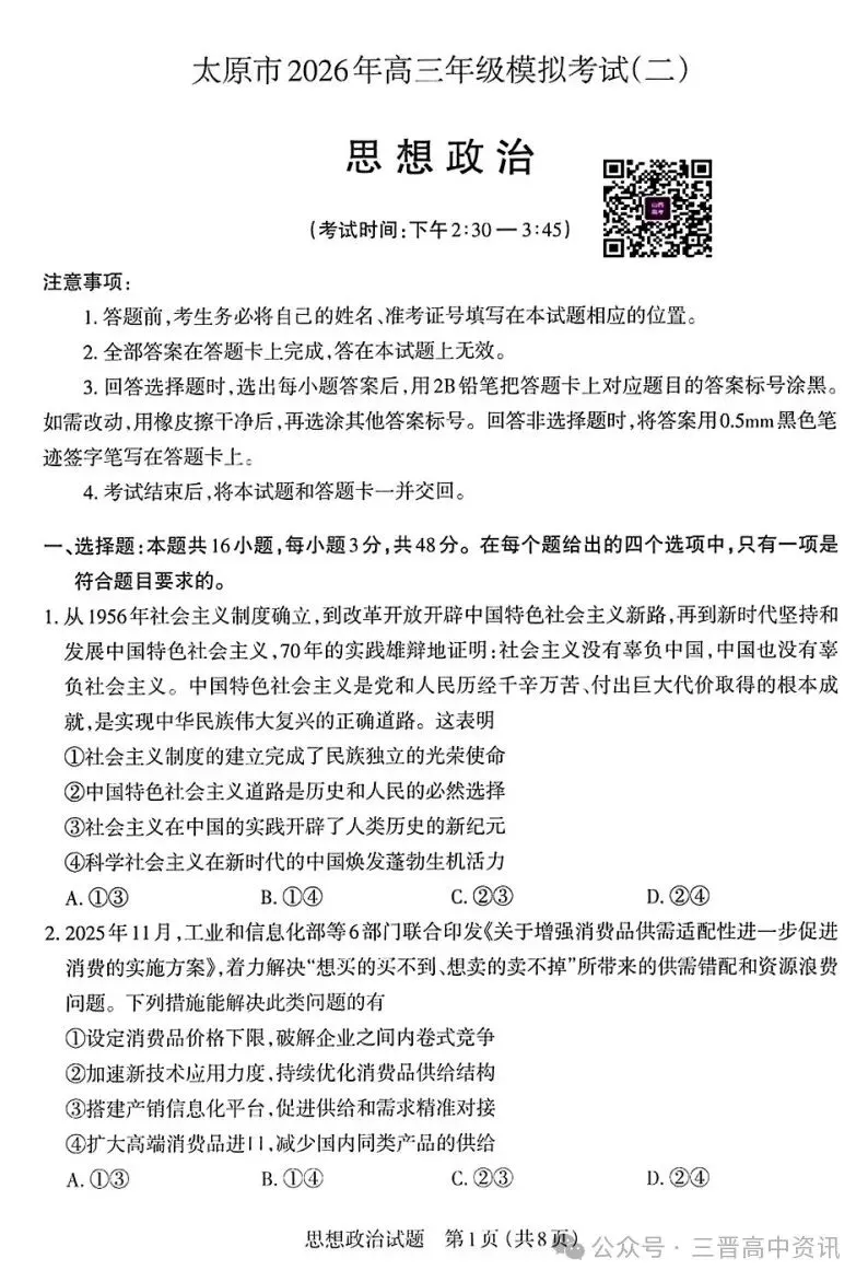 高考日益临近,太原市二模思想政治试卷出炉了。各位太原市的高三学子的做答怎么样,欢迎来估分。