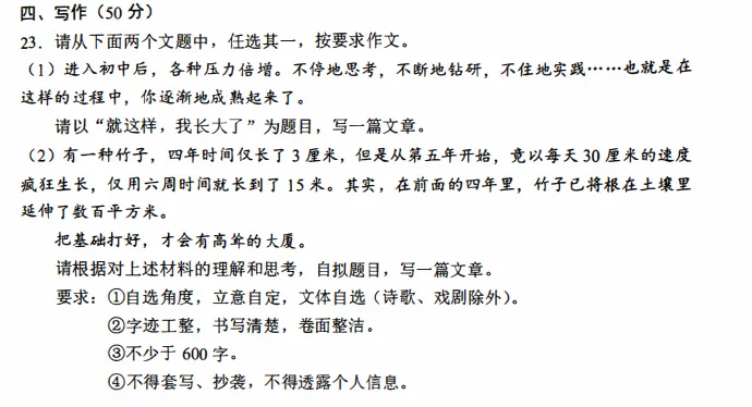 1贴合初中生身份:两道题都围绕「成长」展开,一道写成长的瞬间,一道写成长的规律,完全符合初中生的认知水平和生活经历,让学生有话可说、有素材可写;